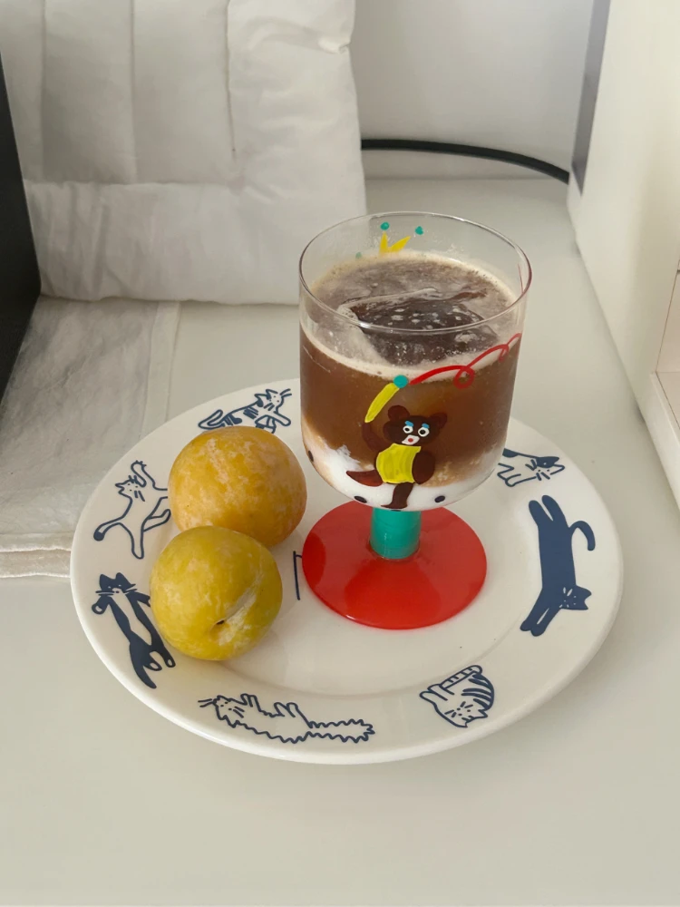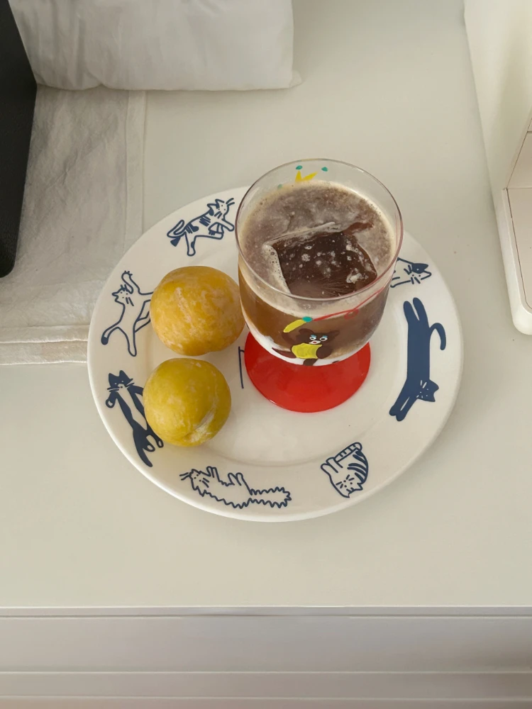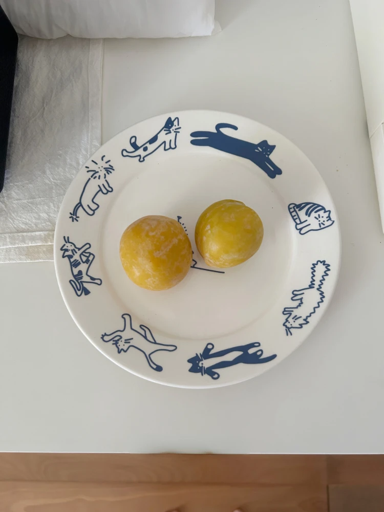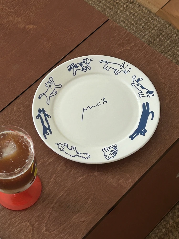 Korean Retro Blue Cat and Dog Pattern Breakfast Western Plate Ceramic Flat Plate