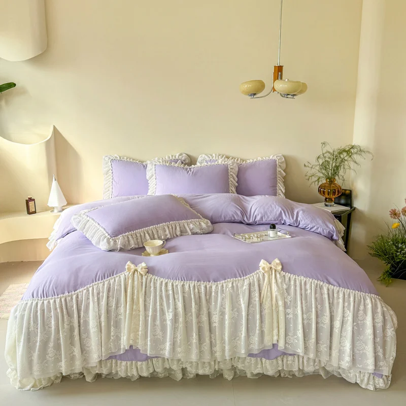 Korean style Princess lace bow bedding set pink sweet girl chiffon ruffles duvet cover bed sheet pillowcase wedding home textile