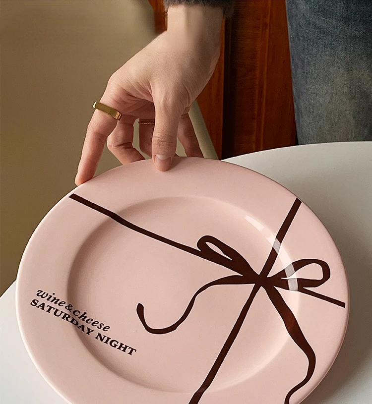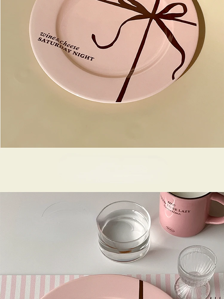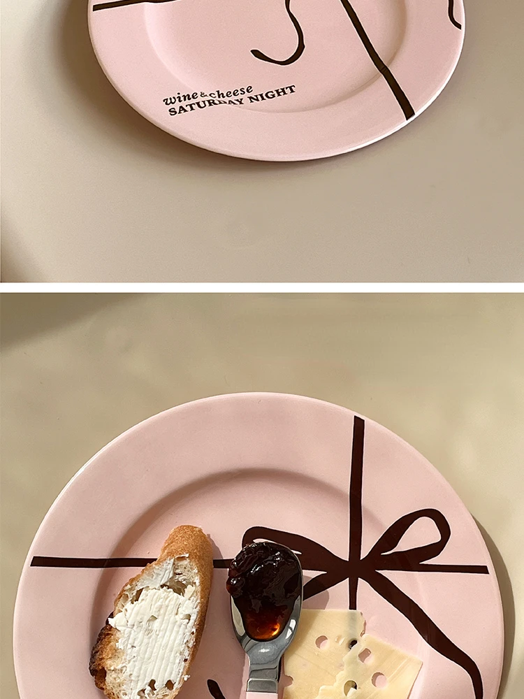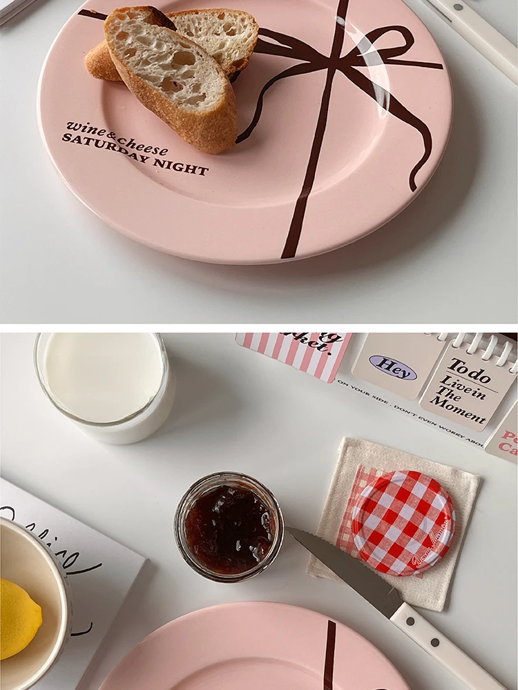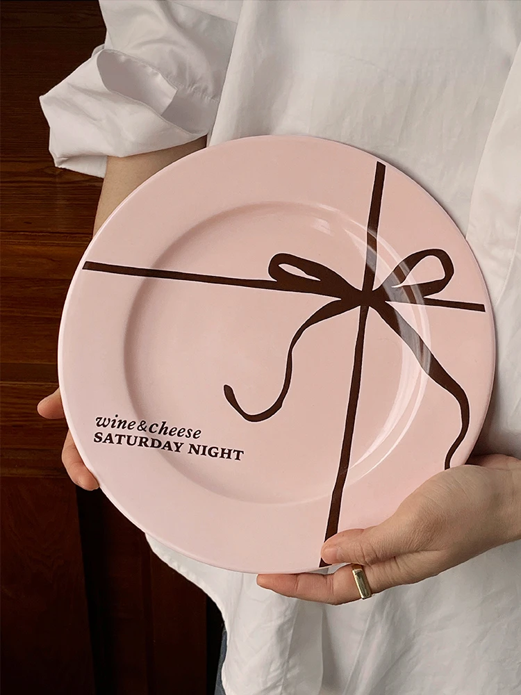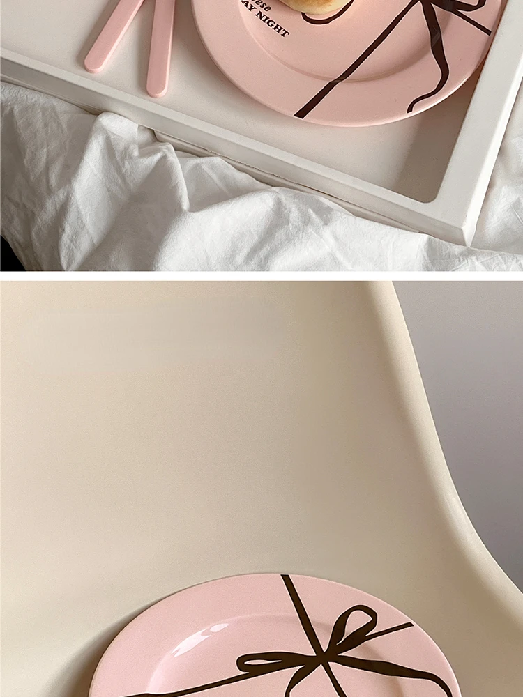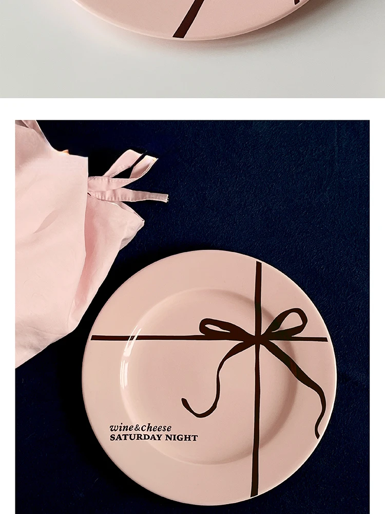 Original Pink Bow Ceramic Plate Flat Plate 10 Inch Large Breakfast Western Plate Dinner Plates