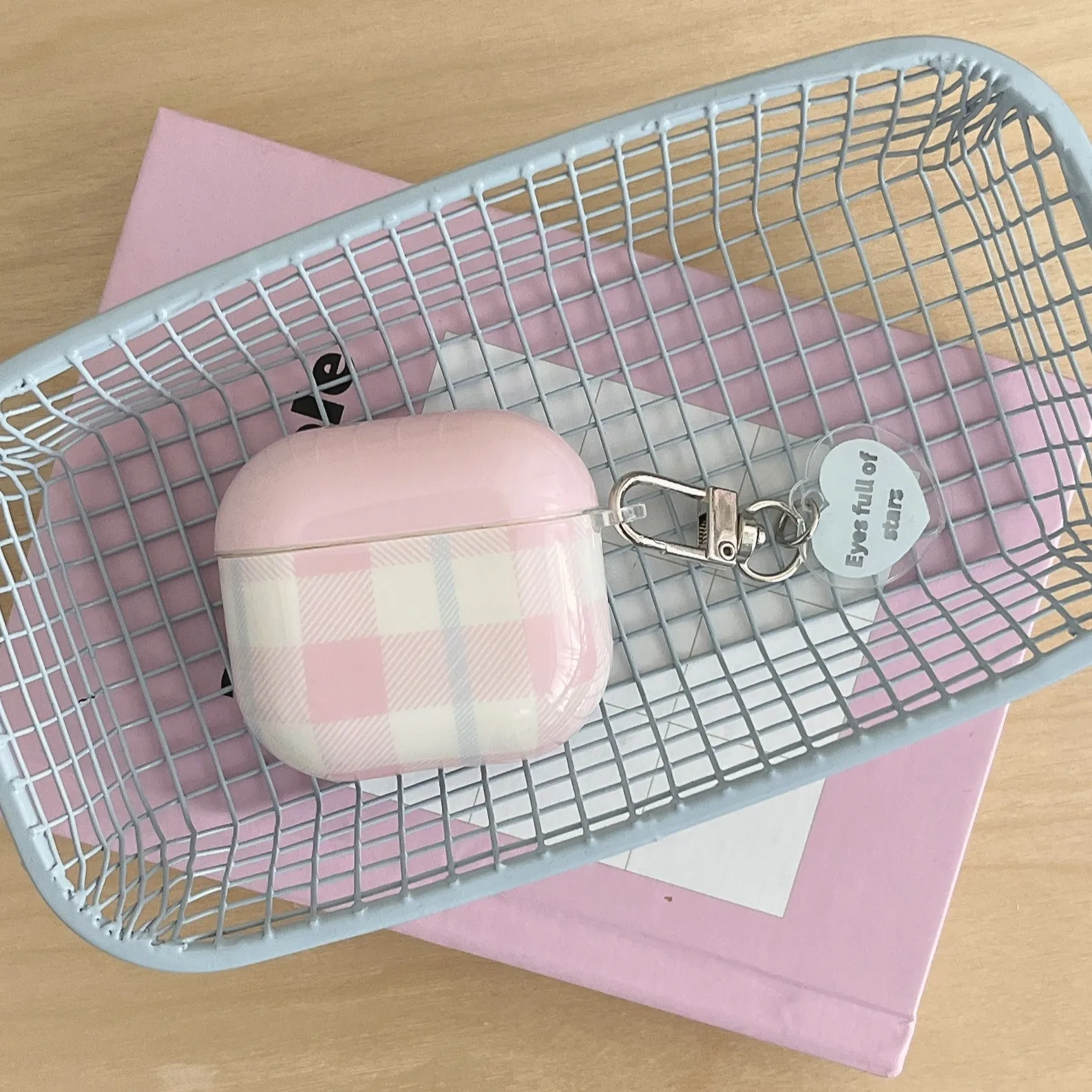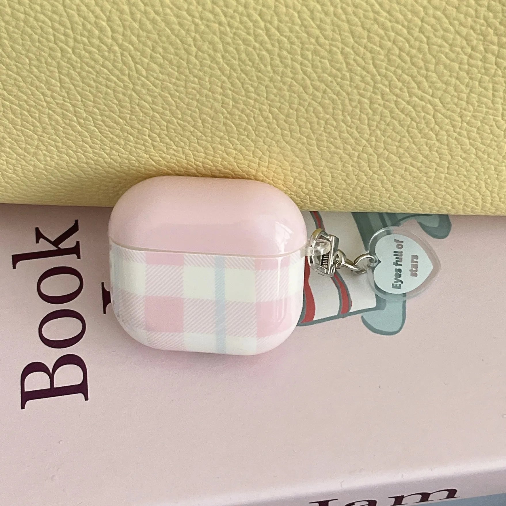 Pink and White Plaid + Heart Pendant Suitable for Apple for Airpodspro2 Case/For Airpodspro Case/For Airpods4 Case/For Airpods3 Case/For Airpods2 Case