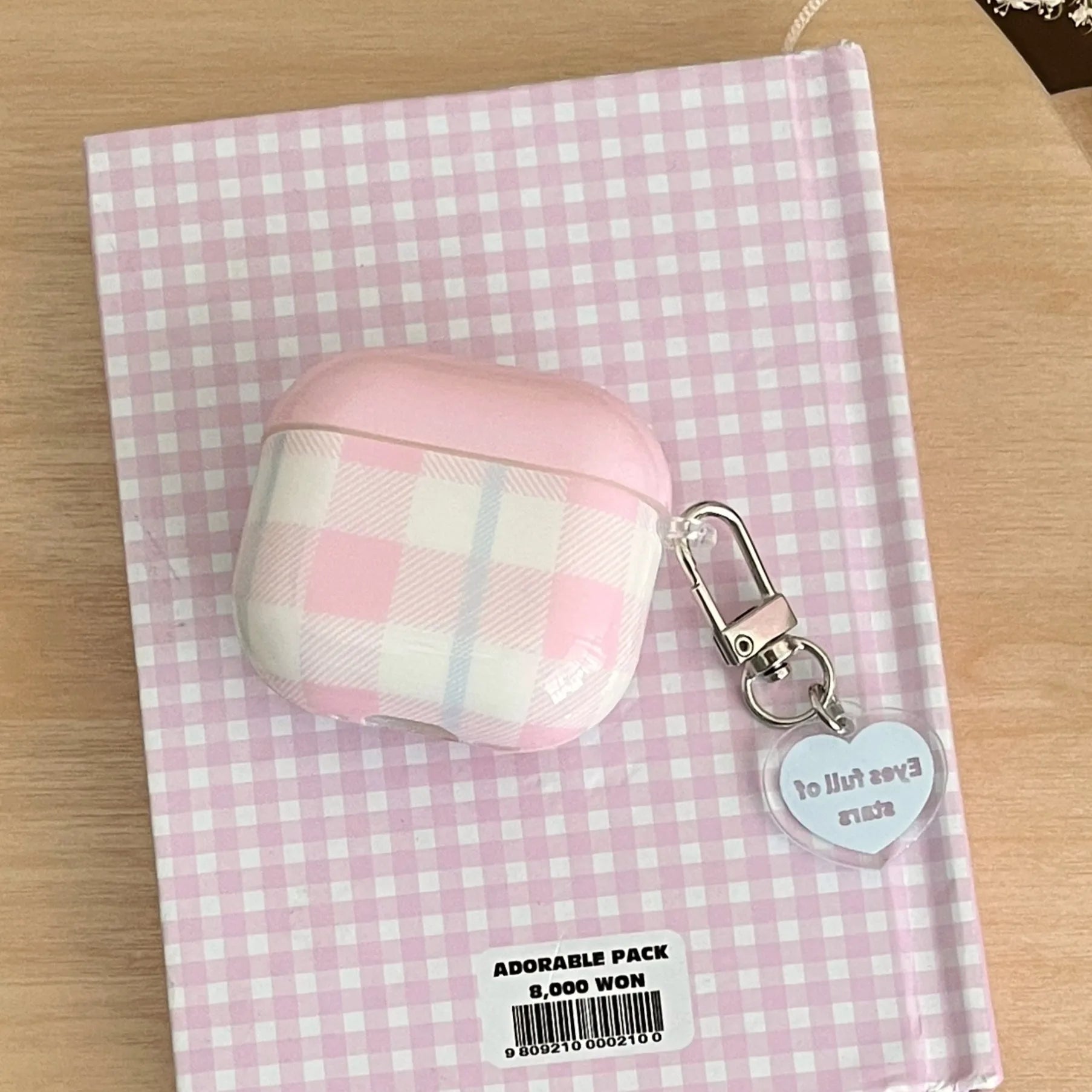 Pink and White Plaid + Heart Pendant Suitable for Apple for Airpodspro2 Case/For Airpodspro Case/For Airpods4 Case/For Airpods3 Case/For Airpods2 Case/Fashionable Women's Earphone Case/Simple Earphone Case