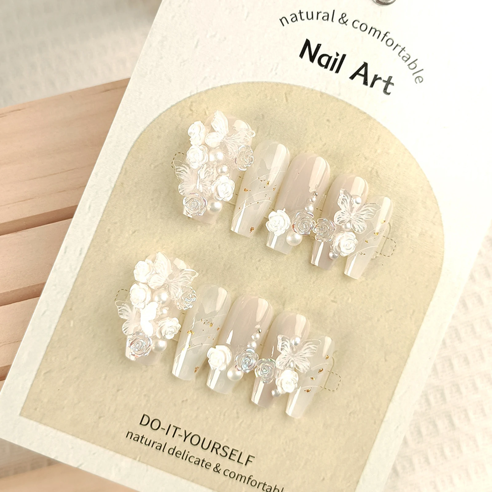 Press On Nails With 3D Crystal Butterfly Pearls Decor Handmade False Nails Aurora Transparent Flowers Fashion Fake Ballet Nails