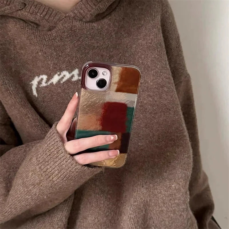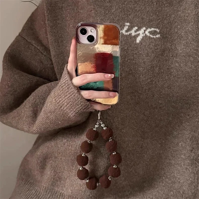 Retro brown red color blocked phone case with fur ball phone chain For iPhone 11 12 13 14 15 pro max
