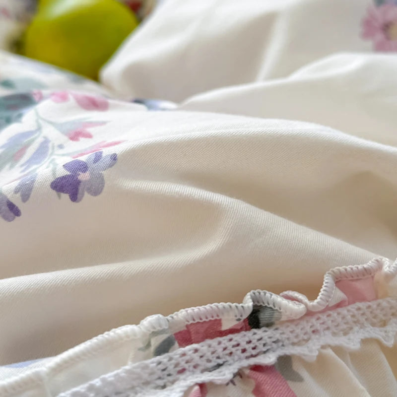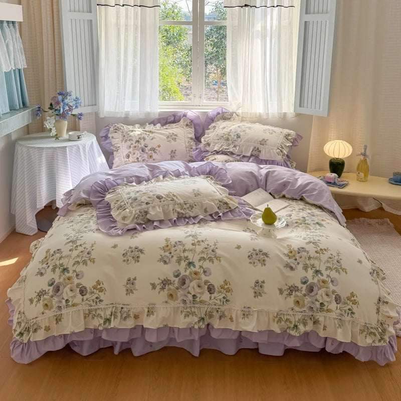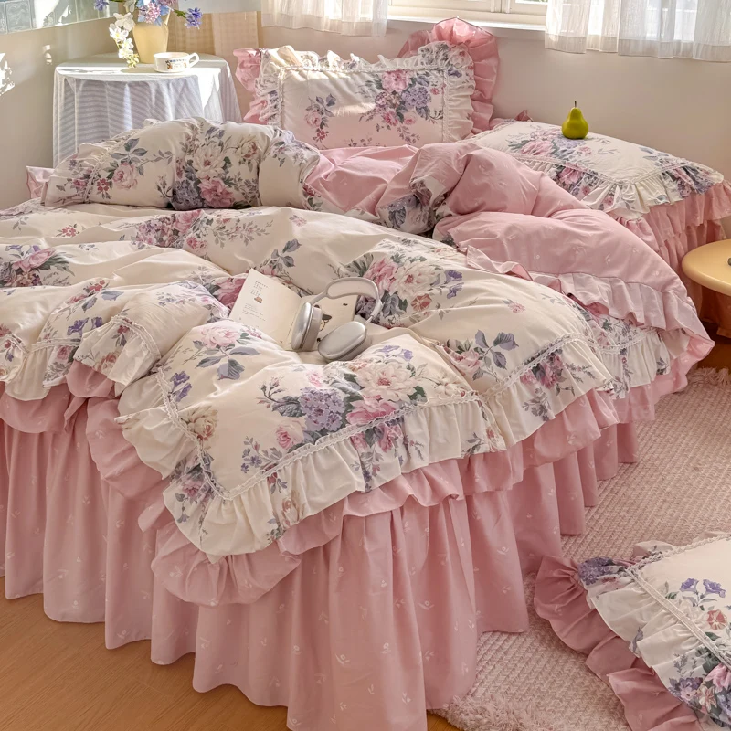 Romantic Flowers Prints Bedding Set Korean Style 100% Cotton Lace Princess Wedding Duvet Cover Bed Skirt Bedspread Pillowcases