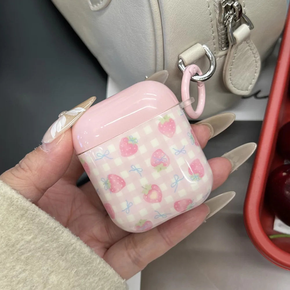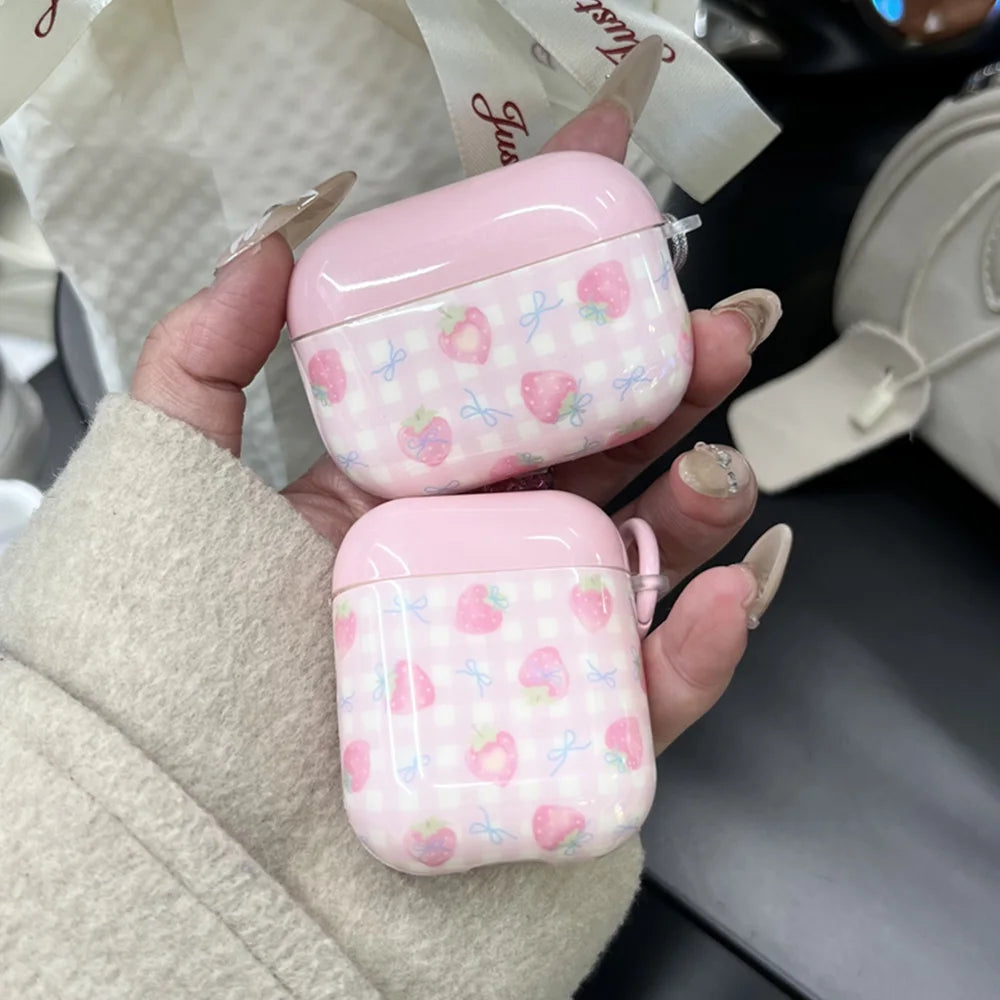 Sweet Pink Strawberry Grid Pattern Cute Transparent Fruit Pendant Earphone Protection Case For AirPods 1 2 3 4 Pro 2 Soft Cover