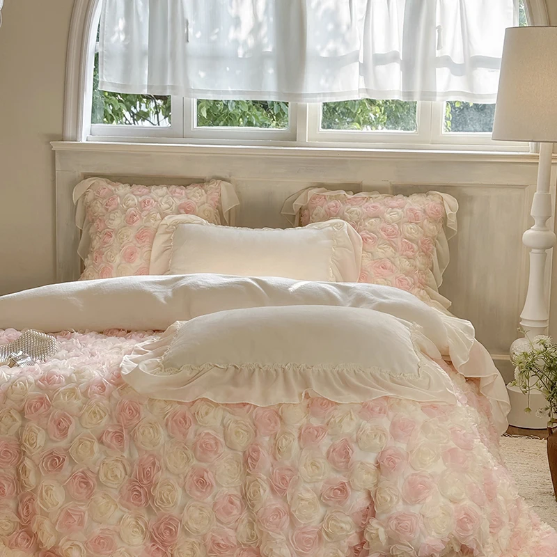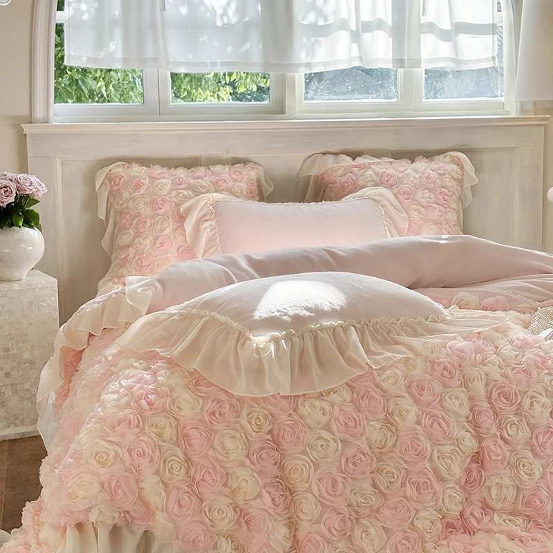 Three-Dimensional Rose Flowers Lace Ruffles Princess Wedding Bedding Set Warm Milk Velvet Duvet Cover Bed Sheet Pillowcases 4Pcs