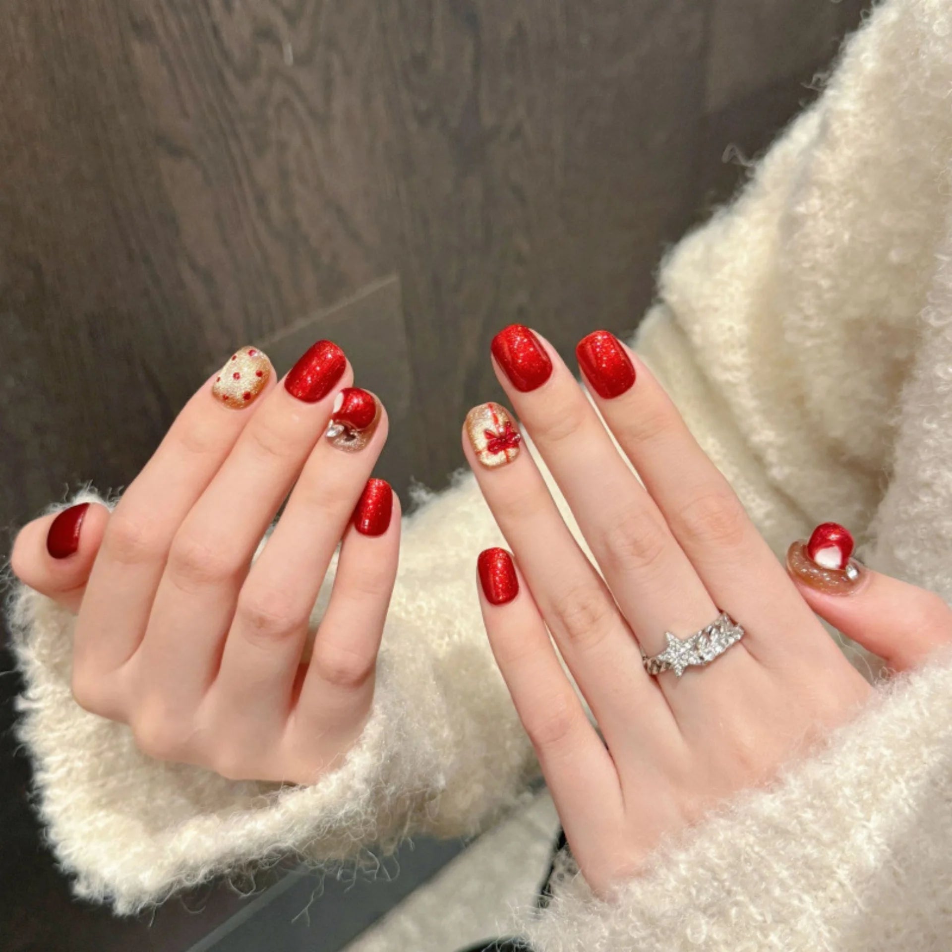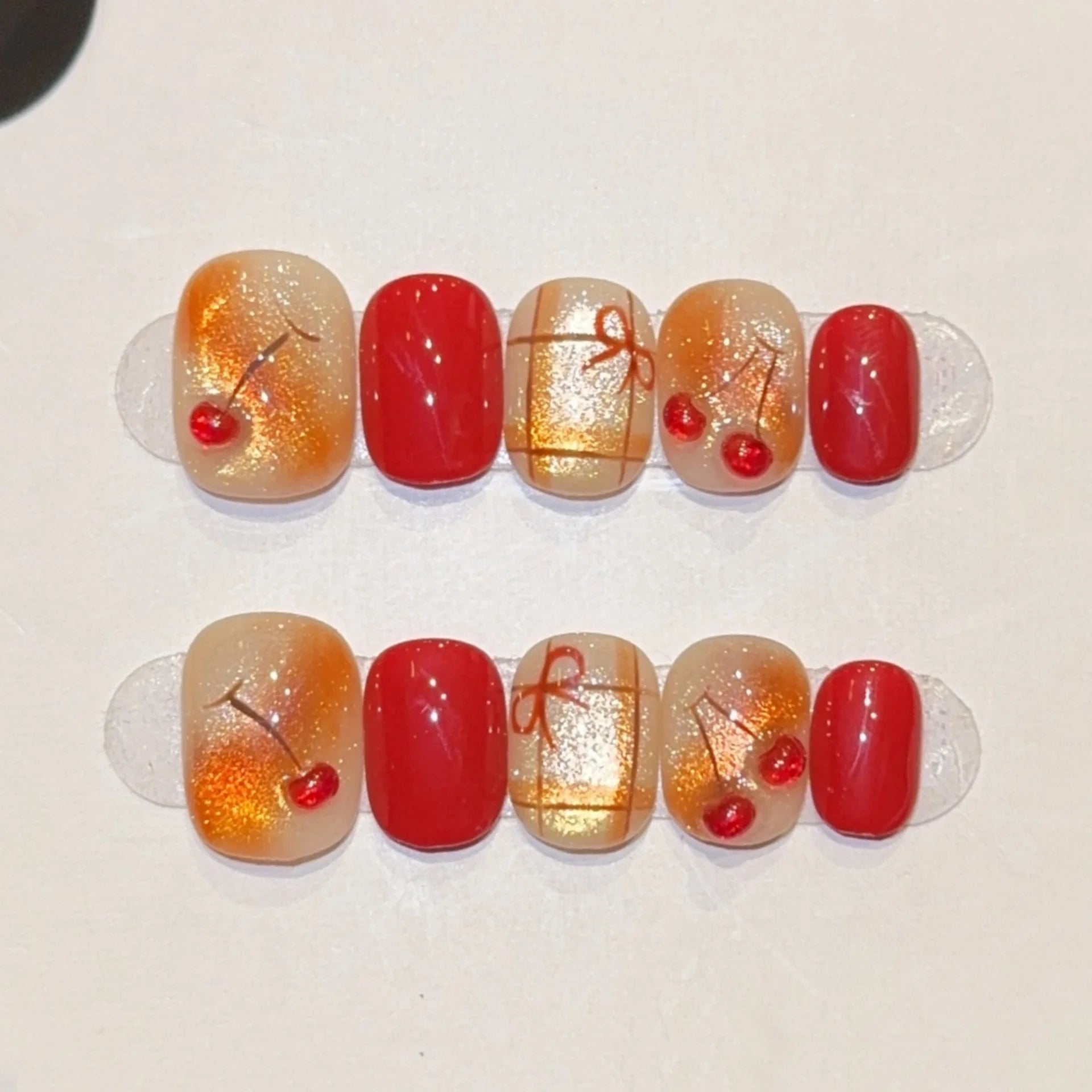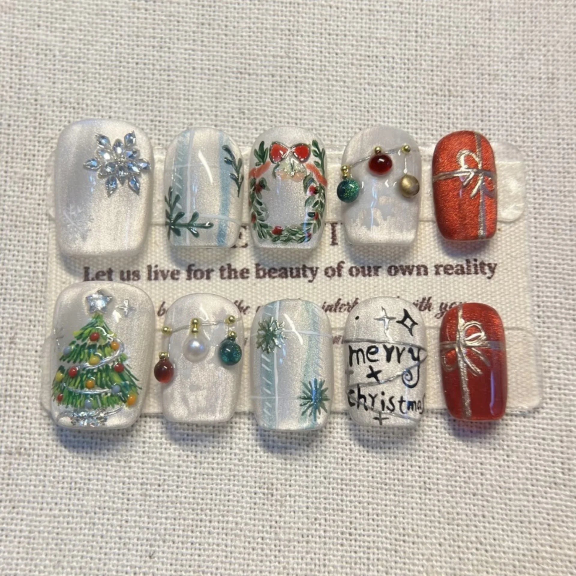 10pcs Handmade False Nail Tip Christmas Cute Red Cat's Eye Short Square Round Press on Nails Art Snowflake Tree Design Fake Nail