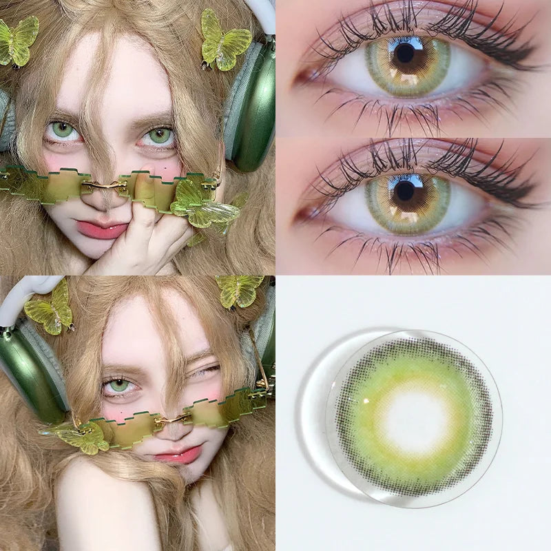 1Pair Green Color Contact Lens Pupils Nature High Quality Myopic Green Lens Blue Eyes - 0.00 to- 8.00 Diopter Lenses