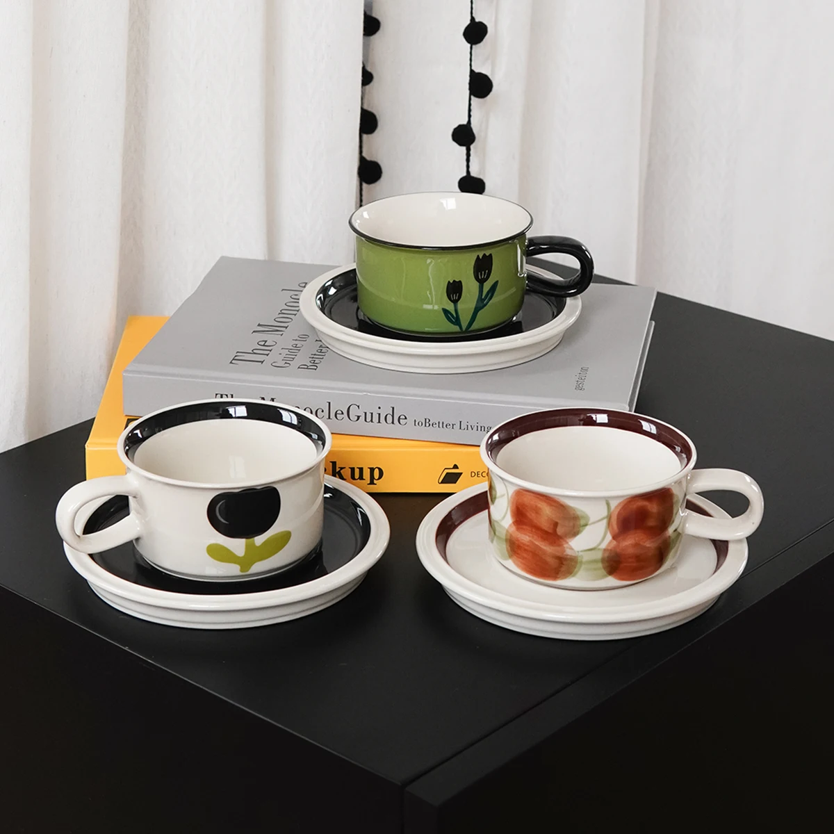 1Set Mid-Century Style Hand-Painted Flower Pattern Ceramic Cup and Saucer, High-End Exquisite Coffee Cup and Saucer, Suitable for Home Decoration, Home Drinking Water, Home Daily Use, Party, Breakfast Milk Cup, Afternoon Tea
