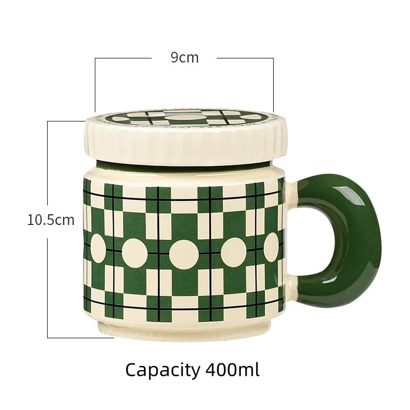 400ML Flowers Ceramic Mug with Lid Creative Checkerboard Grid Pattern Coffee Mug Home Office Breakfast Milk Cup Birthday Gift