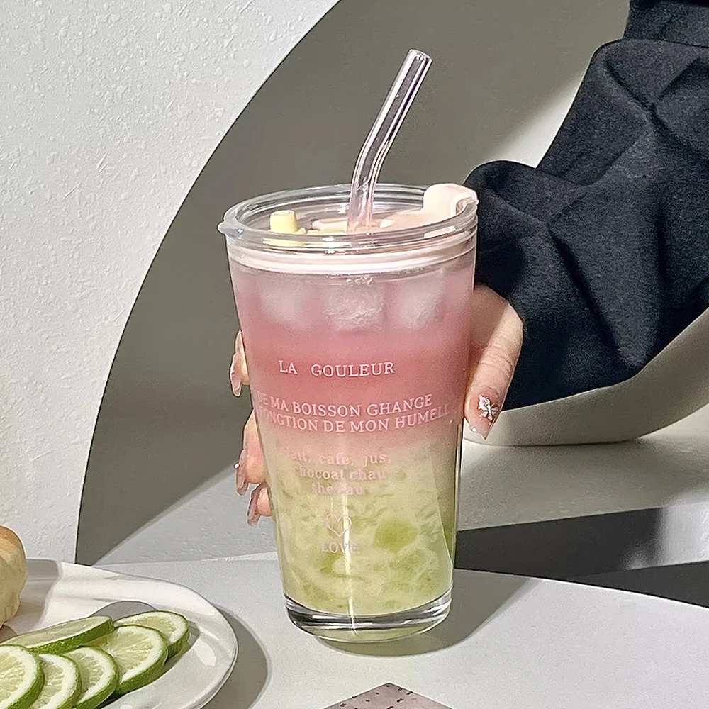 Cute Glass Cup With Straw And Lid Letter Tumbler 450ml Iced Coffee Juice Tea Glass Drinking Cups Transparent Bubble Tea Cup Gift