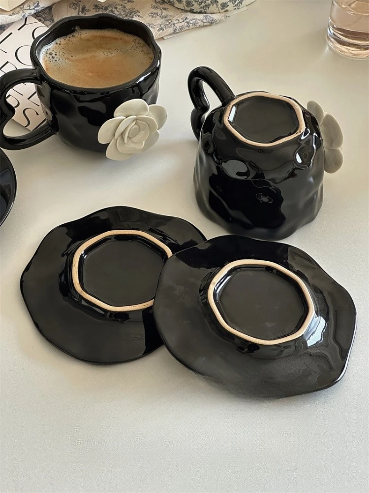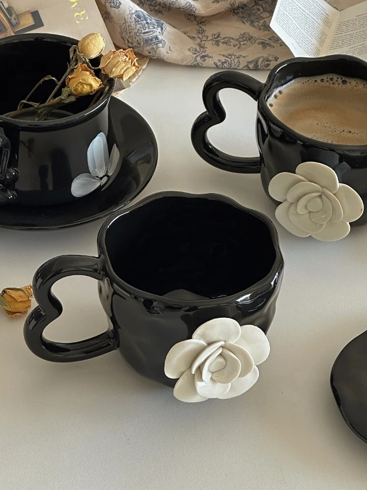 Handmade 3D Camellia Flower Black Coffee Afternoon Tea Cup Plate Ceramic Cup Gift Cup