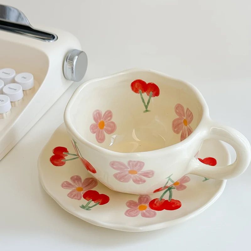 Korean Style Flower pattern Ceramic Cup and Saucer Set Hand Pinched Irregular Coffee Cup Milk Cup Afternoon Tea Tableware Gifts