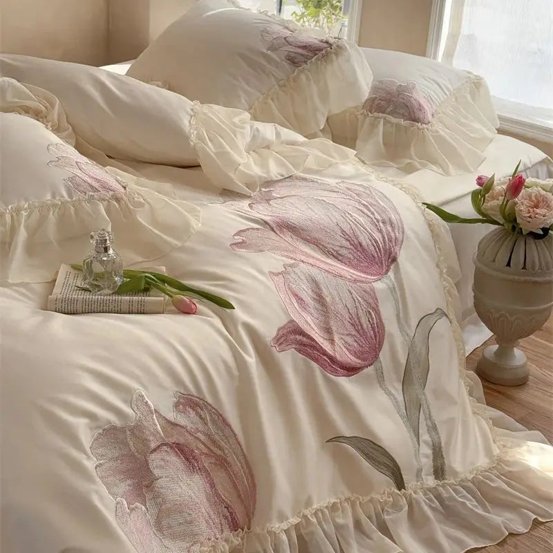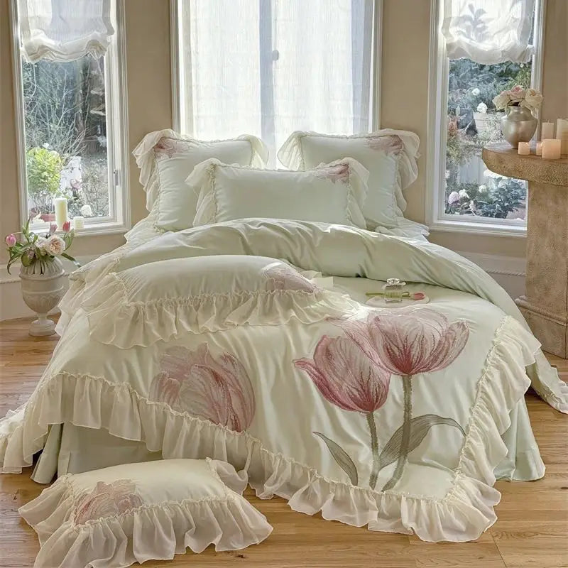 1200TC Egyptian Cotton Flowers Embroidery Lace Ruffles Princess Bedding Set Duvet Cover Flat/Fitted Bed Sheet Pillowcases 4Pcs