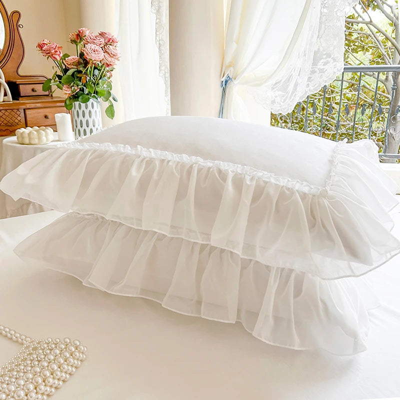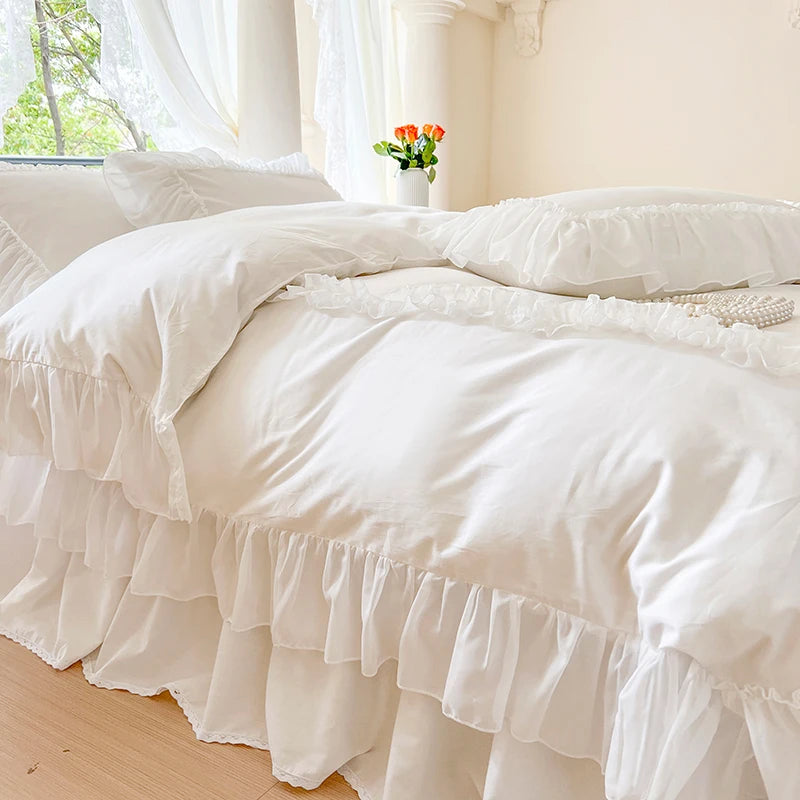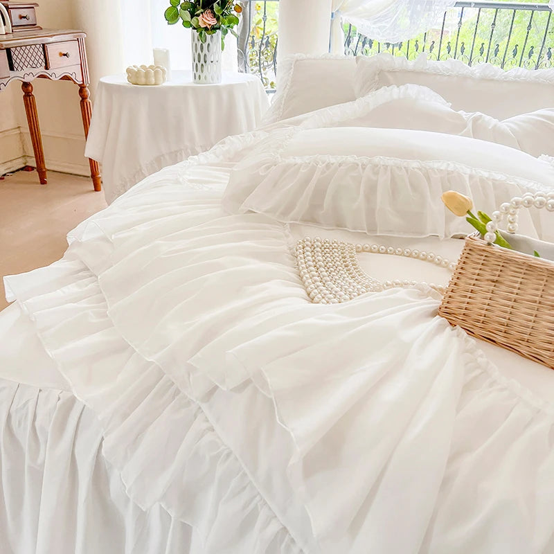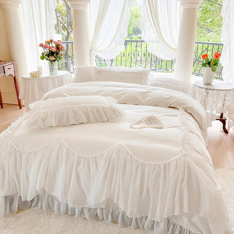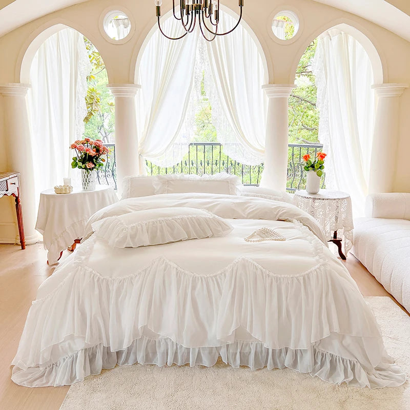 4/6Pcs White Pink Sweet Princess Wedding Bedding Sets Luxury Chiffon Lace Ruffle Duvet Cover Set Bedspread Bed Skirt Pillowcases