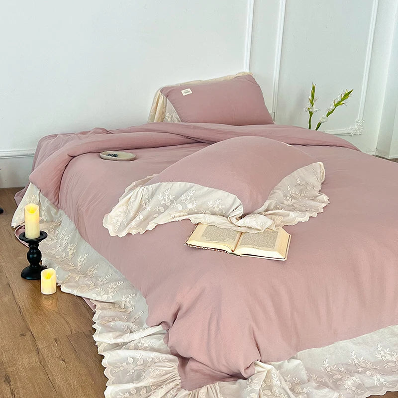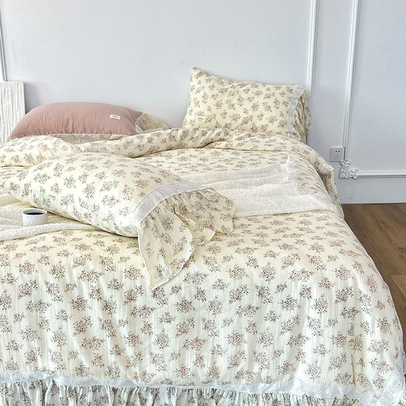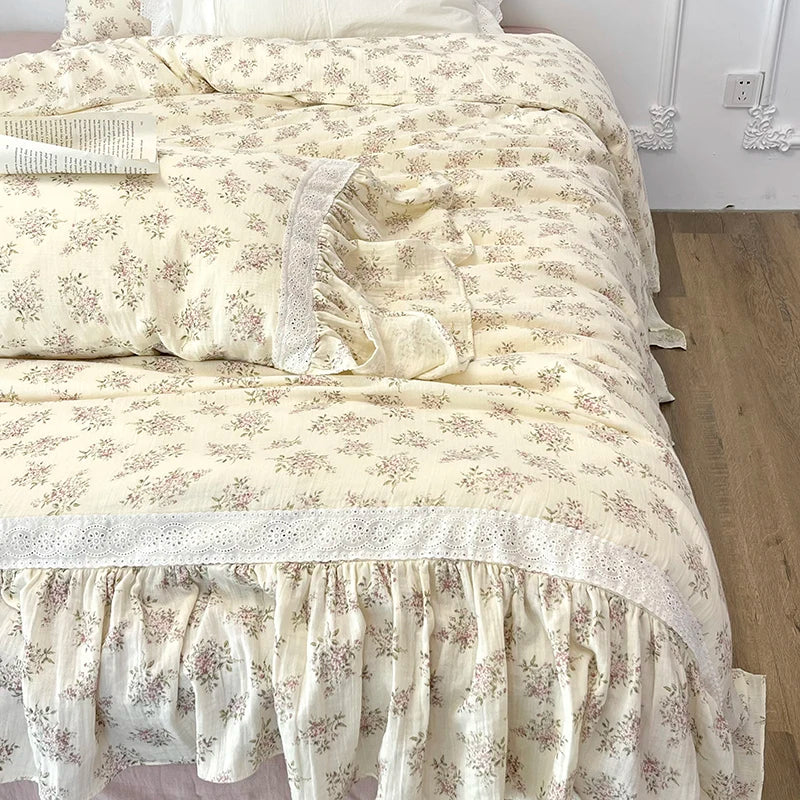 Premium 100% Gauze Cotton Farmhouse Floral Large Ruffles Bedding Set Soft Crepe Duvet Cover Bed Sheet/Fitted Sheet Pillowcases