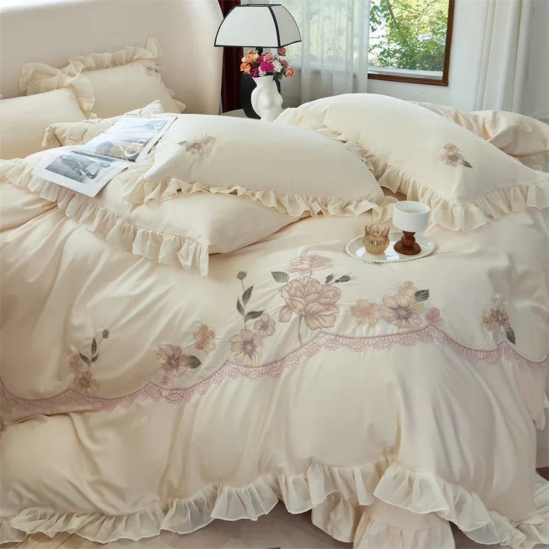 Premium Egyptian Cotton Flowers Embroidery Lace Ruffles Princess Bedding Set Duvet Cover Set Flat/Fitted Sheet Pillowcases 4Pcs