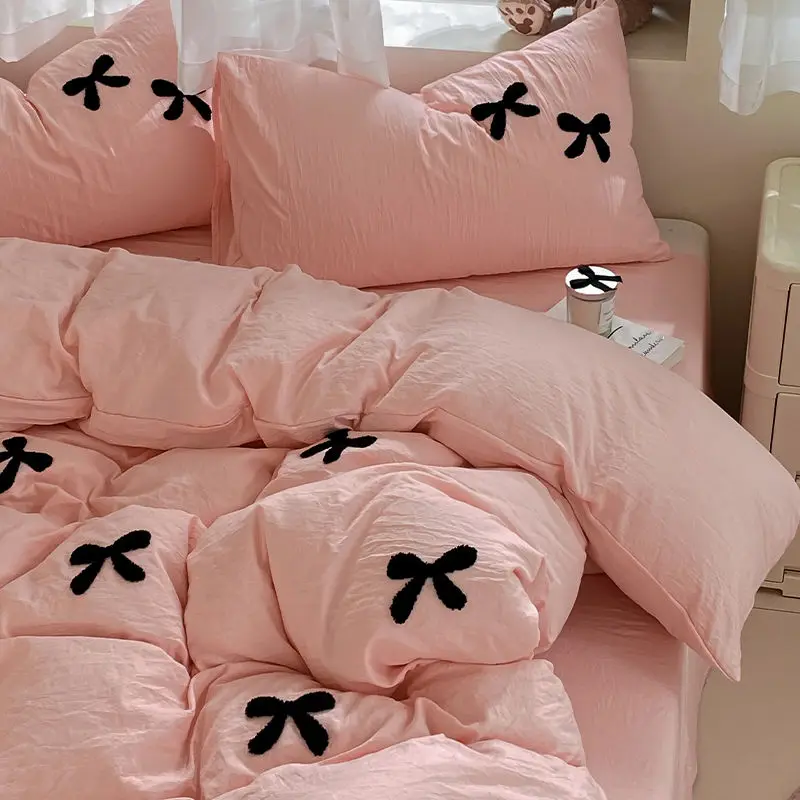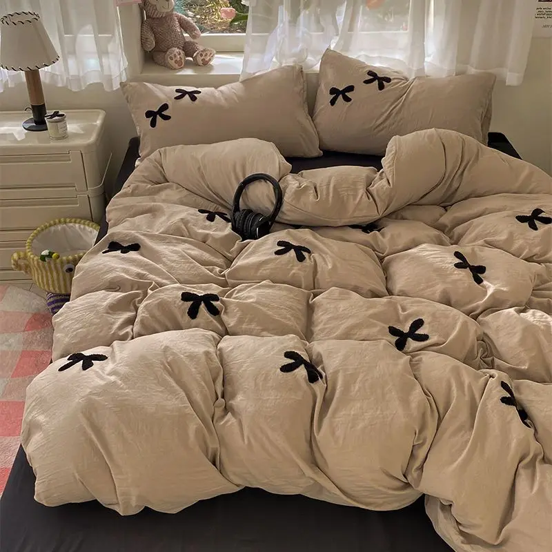 Skin Friendly Washed Cotton Bow Towel Embroidered Duvet Cover Set NO Filler Girls Princess Home Bedding Flat Sheet Pillowcase