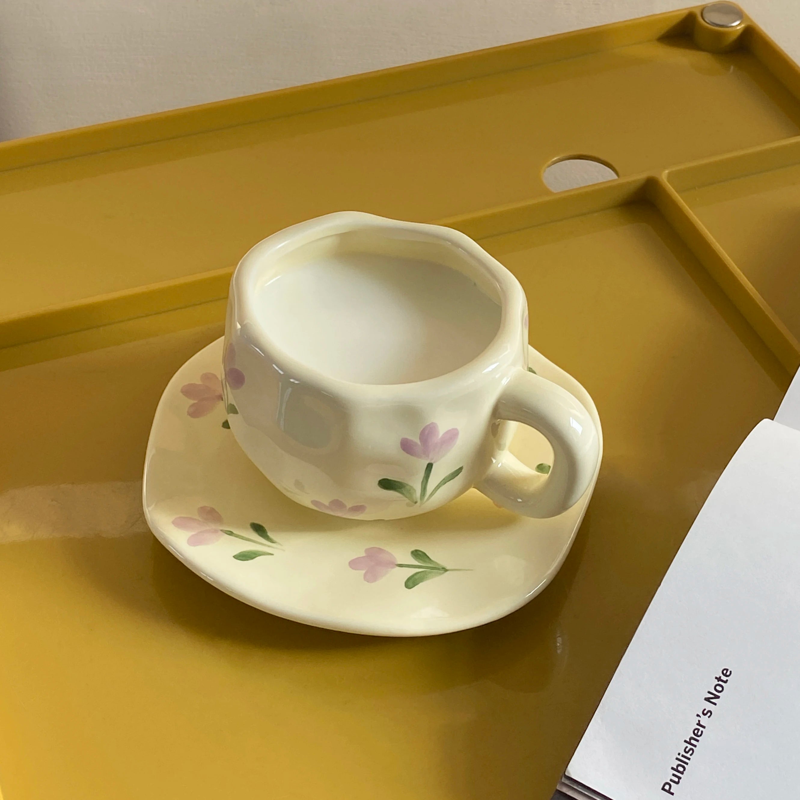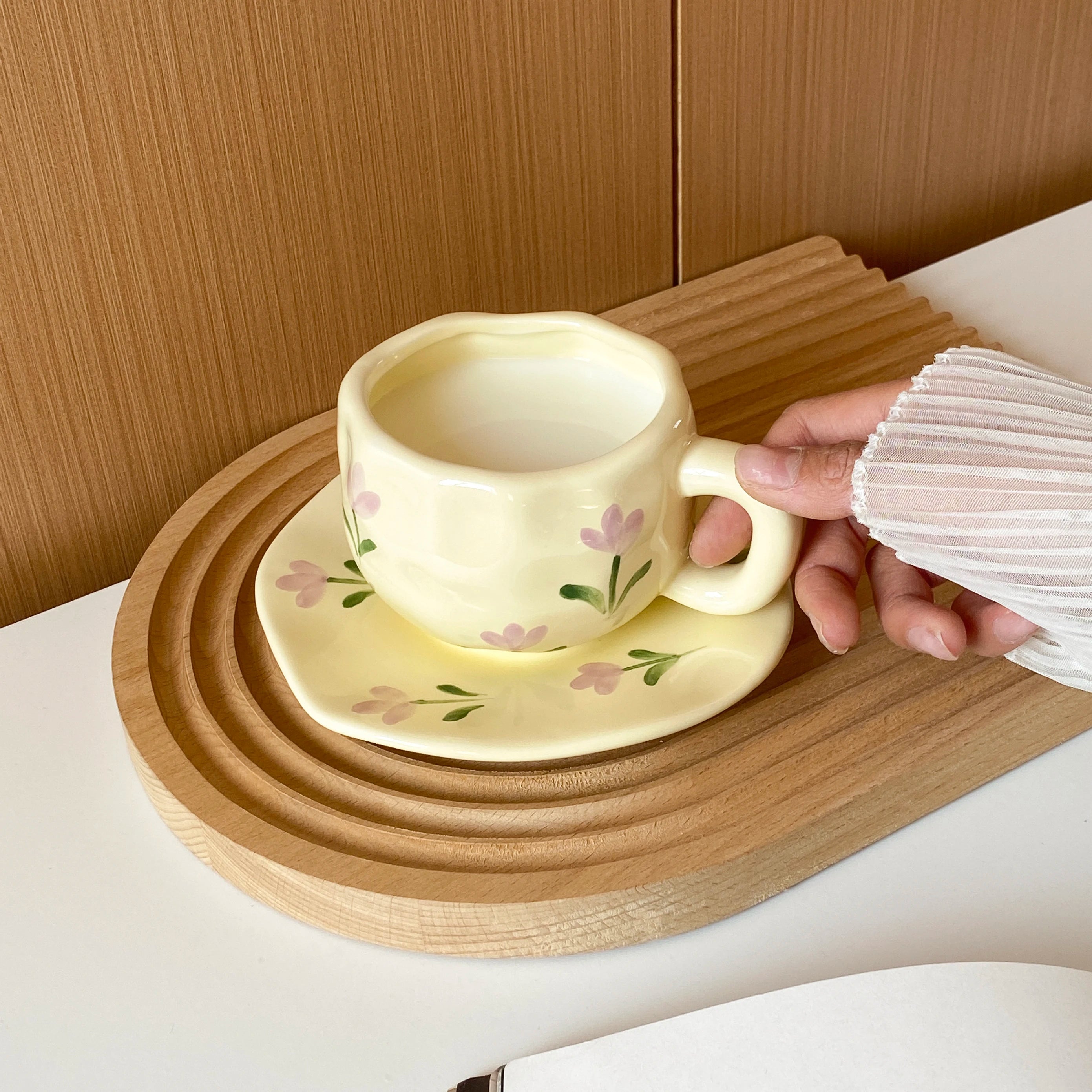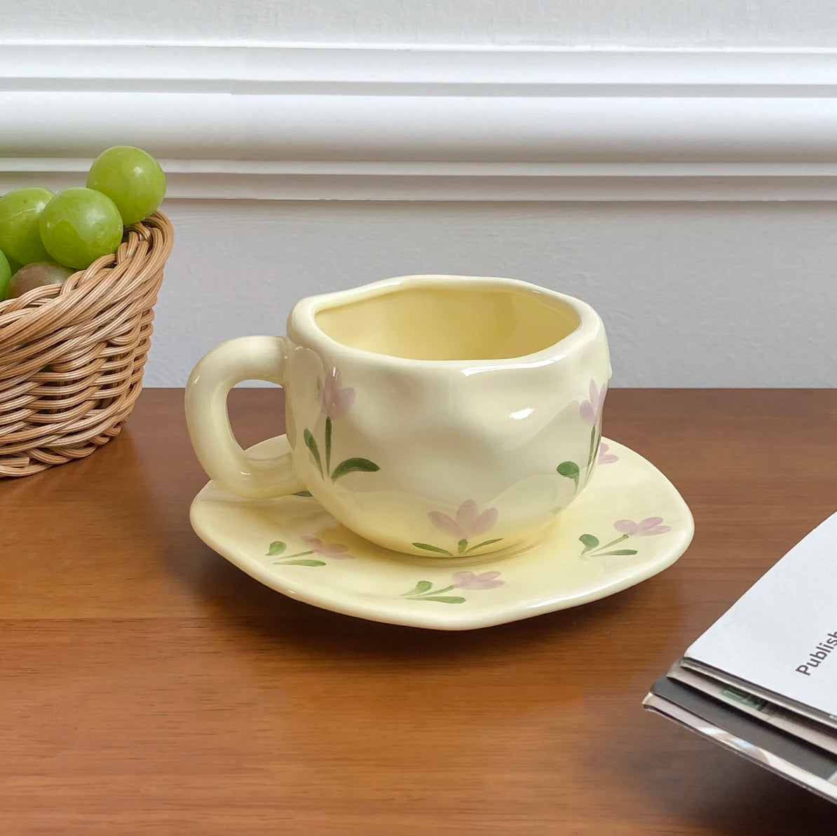 1Set Ceramic Asymmetrical Hand-Kneaded Coffee Cup and Saucer, High-Looking Purple Tulip Coffee Cup and Saucer, Suitable for Home Decoration, Home Drinking Water, Party Party, Camping Style Picnic, Gift Giving