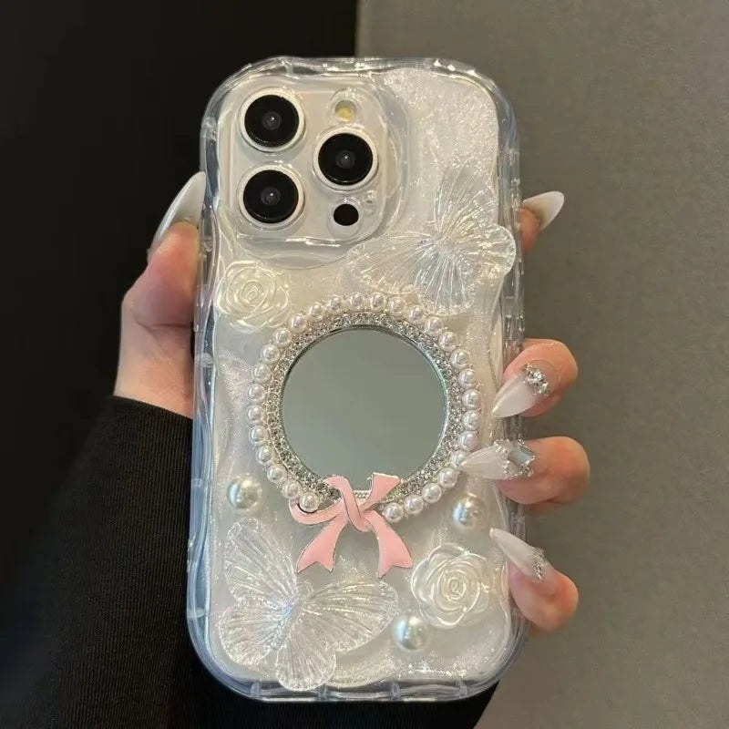 Shiny 3D Butterfly Flower Pearl Case For iPhone 14 13 12 11 15 16 Pro Max Luxury Bow Diamond Makeup Mirror Back Cover