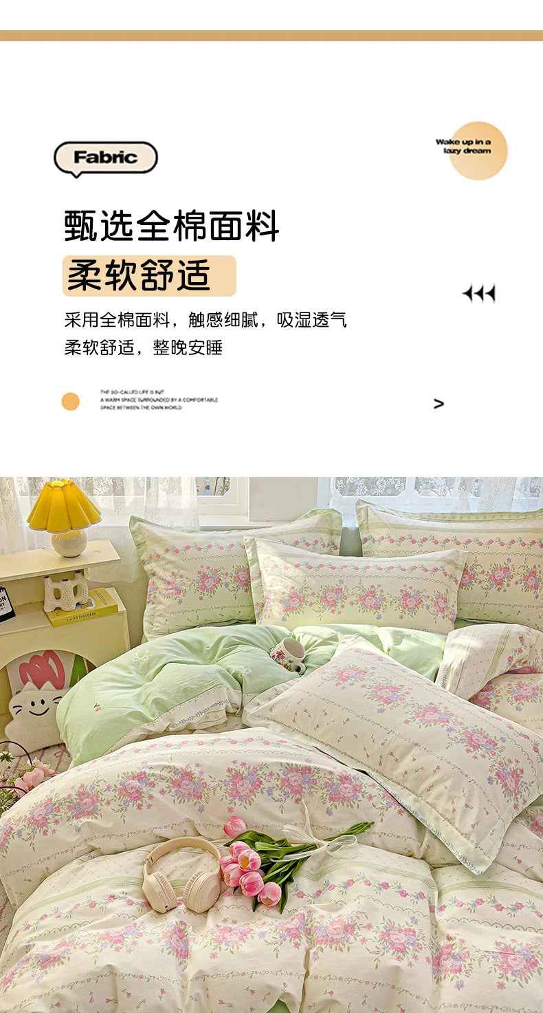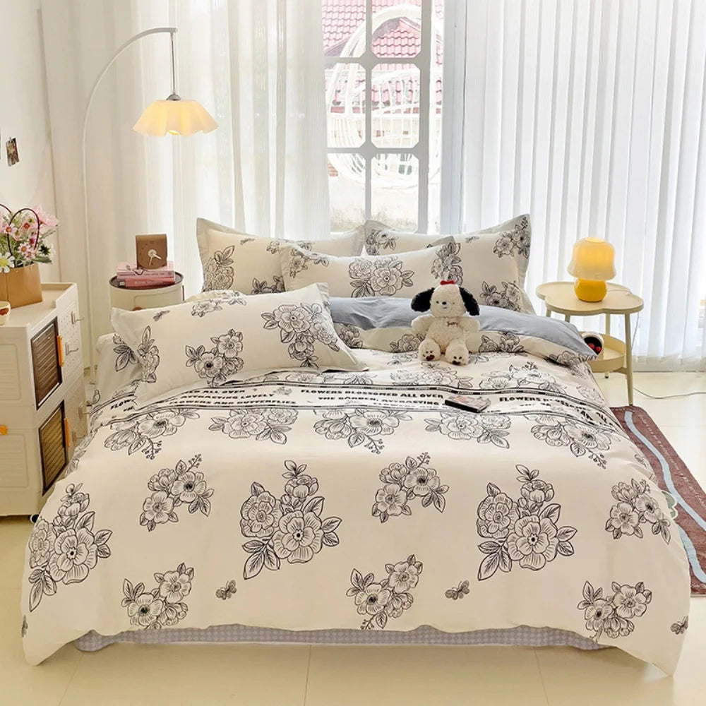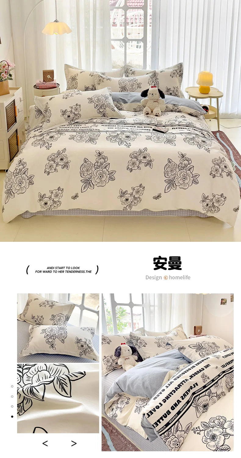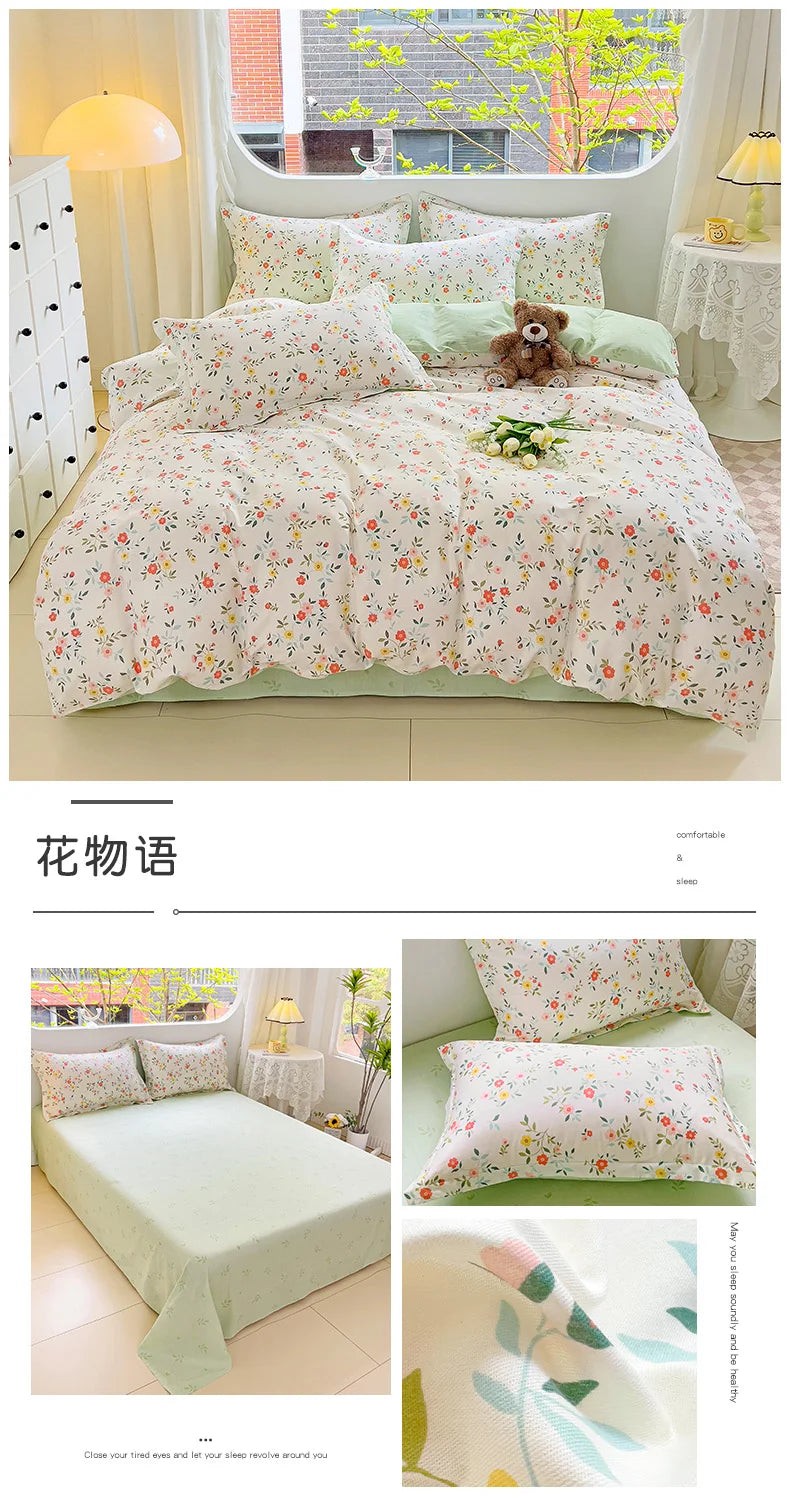 100% Cotton Four Piece Set Soft Skin-friendly Duvet Cover Set Single Couple Flower Printed Comforter Bedding Set for Adults Kids