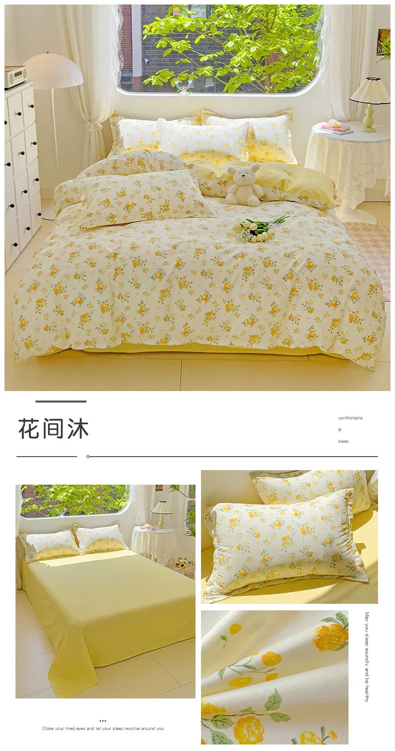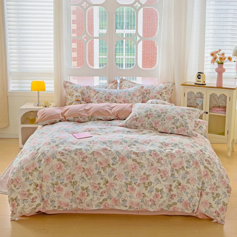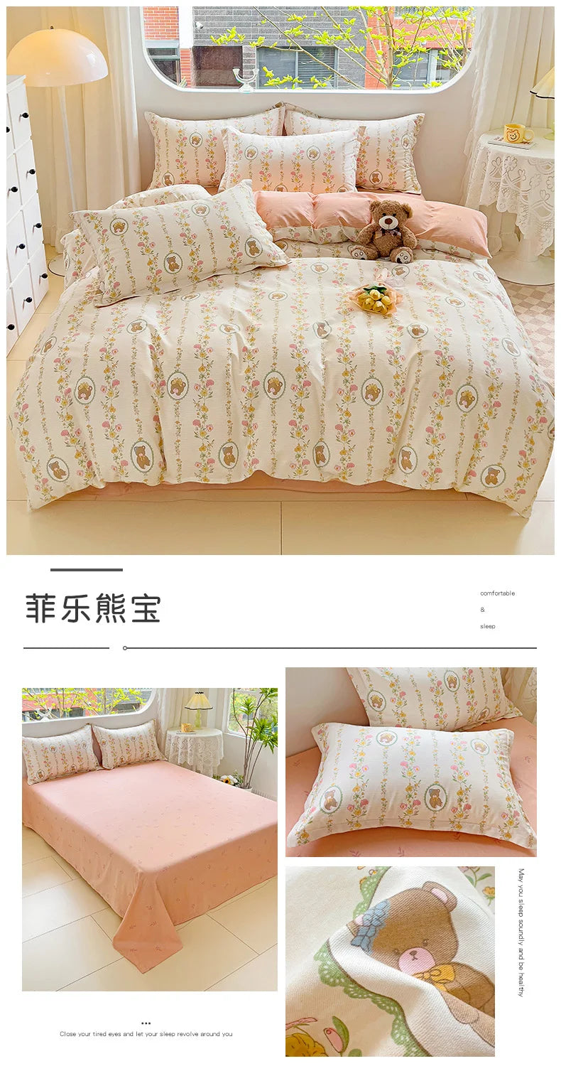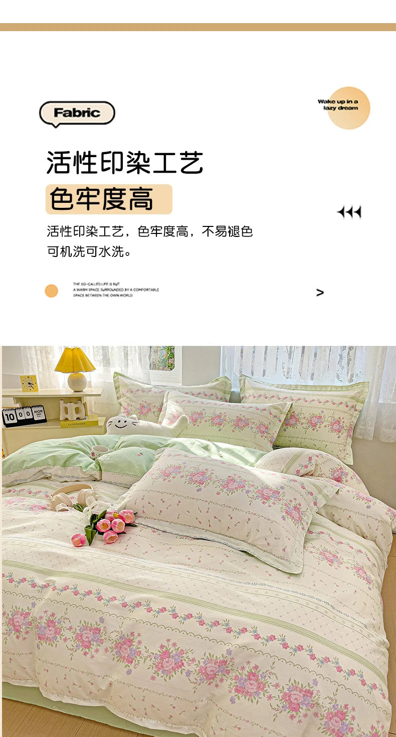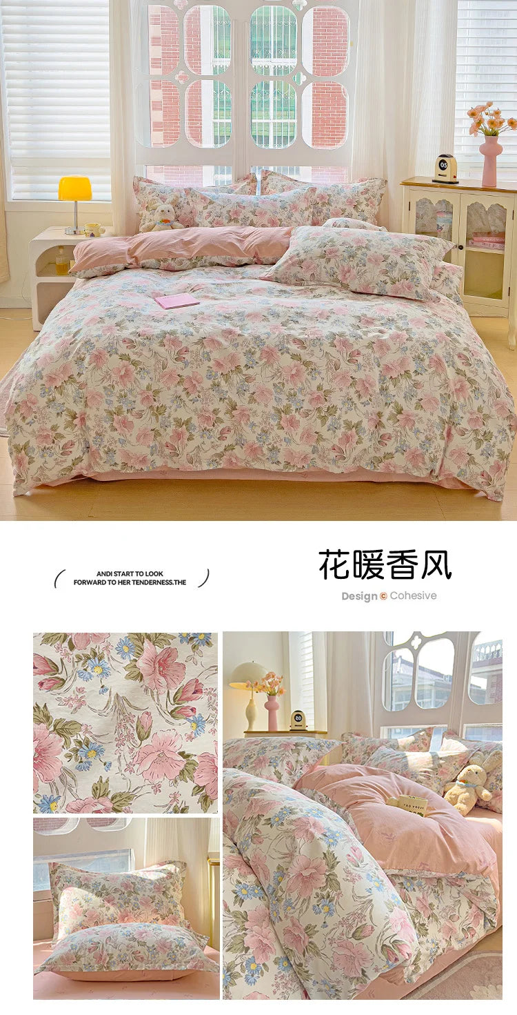 100% Cotton Four Piece Set Soft Skin-friendly Duvet Cover Set Single Couple Flower Printed Comforter Bedding Set for Adults Kids