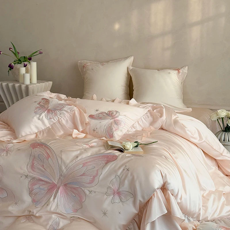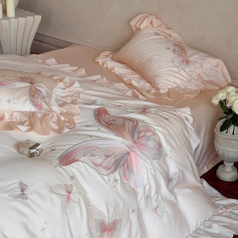 100% Cotton Gorgeous Bedding Set Butterfly Embroidery Flat Sheet Pillowcases Queen Size For Women Bare Sleeping Skin-Friendly