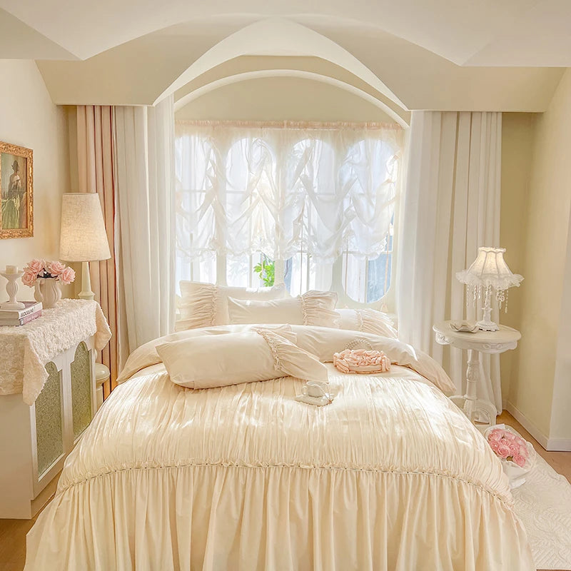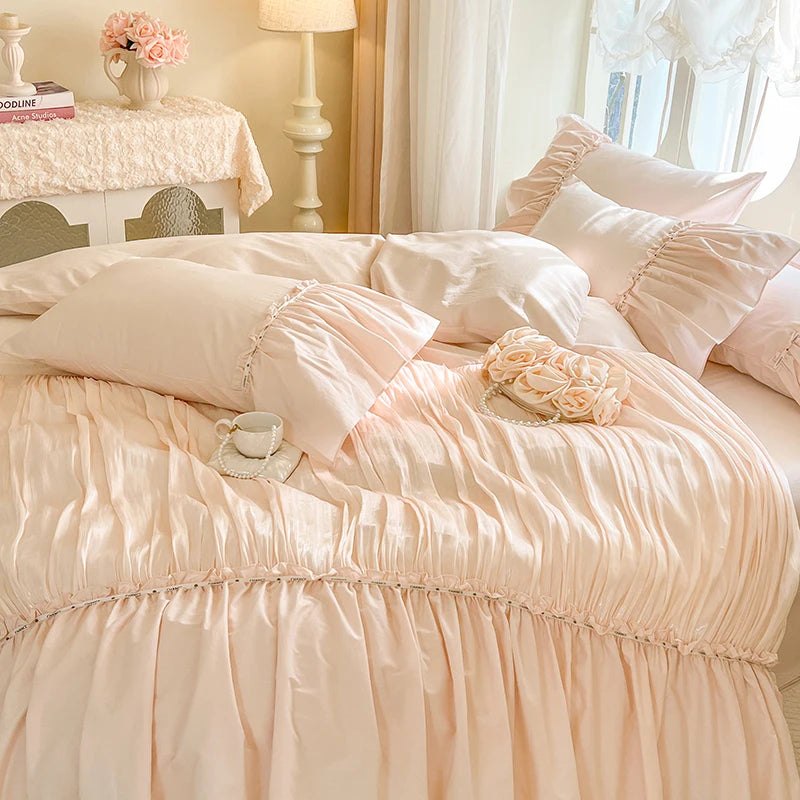 100% Cotton Pleated Lace Ruffles Korean Princess Style Duvet Cover Set Bed Sheet Or Fitted Sheet Pillowcases Girls Bedding Set