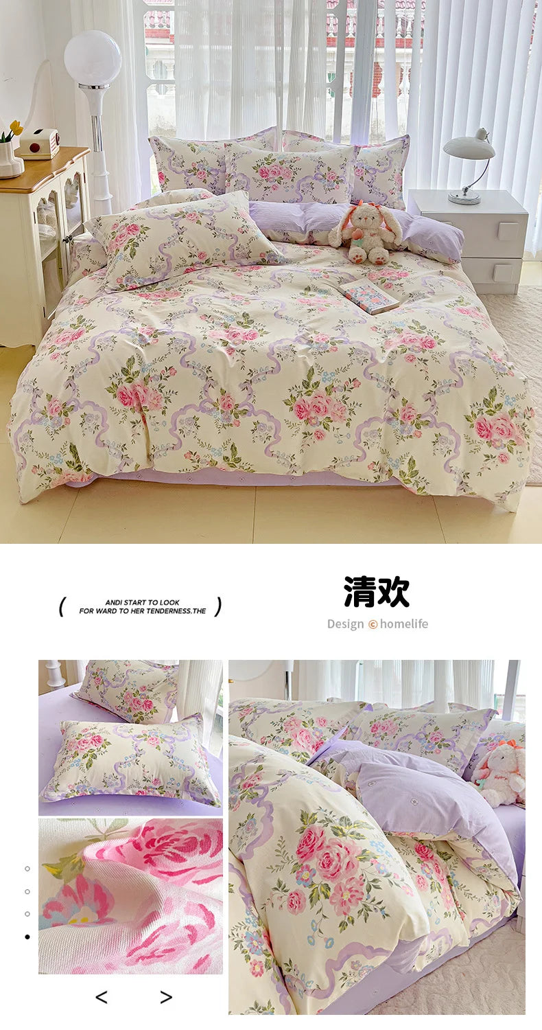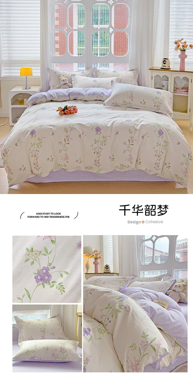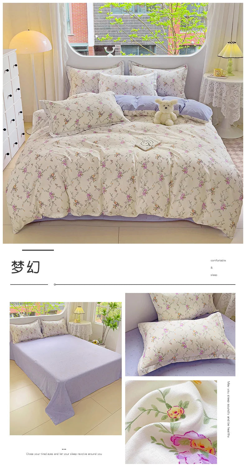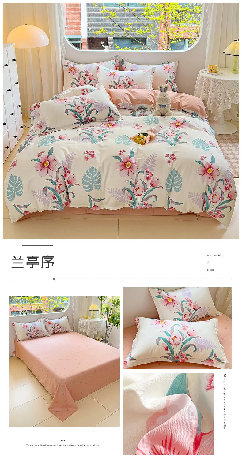 100% Cotton Skin-friendly Four Piece Set Soft Duvet Cover Set Single Couple Flower Printed Comforter Bedding Set for Adults Kids