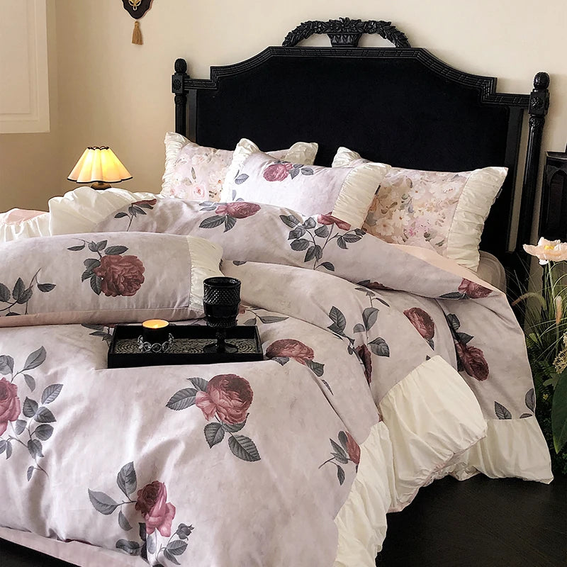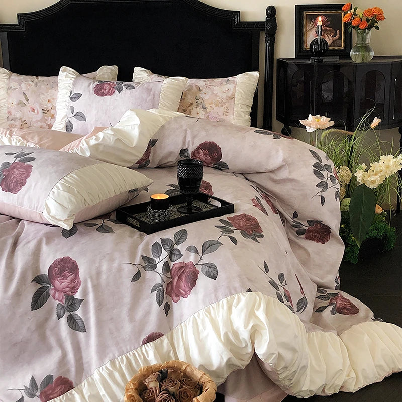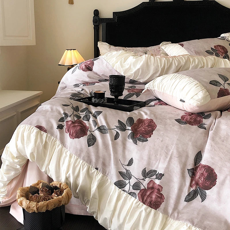 100% Long-Staple Cotton Bedding Set Gorgeous Floral Romantic Rose Flat Bed Sheet Set Pillowcases Queen King Size Bed Linen Set