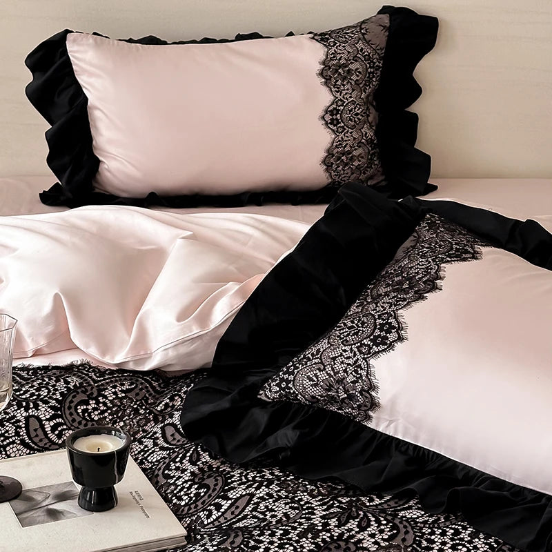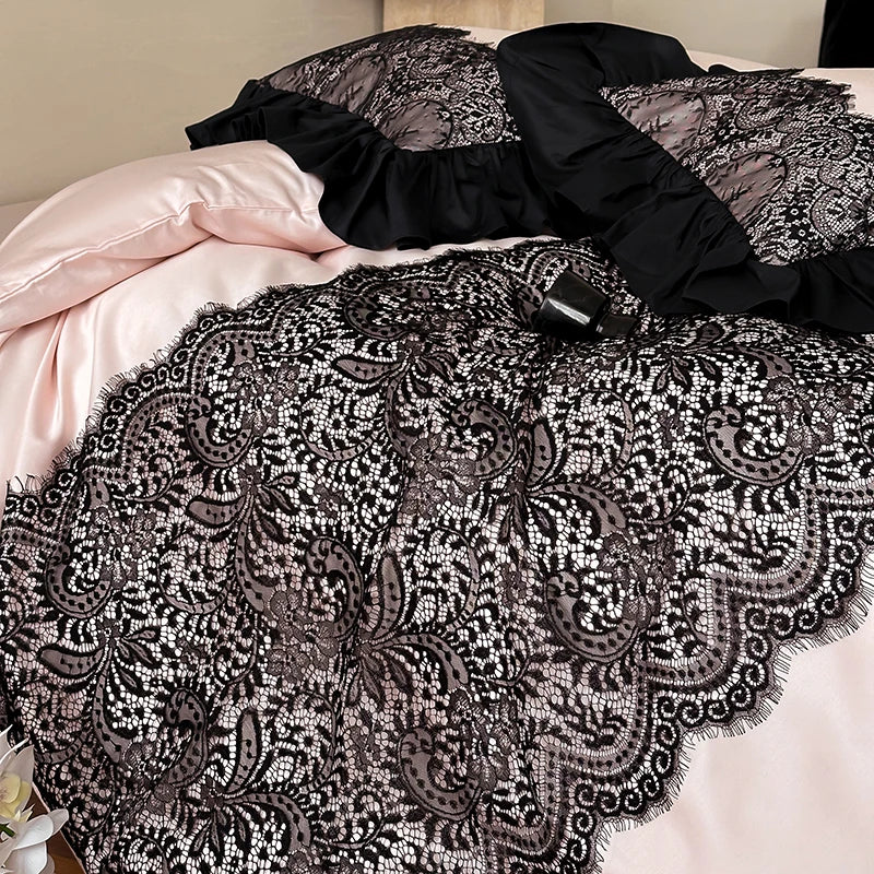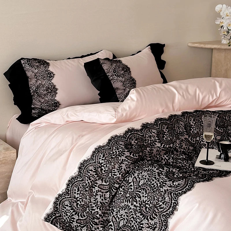 1000TC Egyptian Cotton Black Lace Patchwork Bedding Set Queen King Size Duvet Cover Set Flat/Fitted Bed Sheet Pillowcases 4Pcs