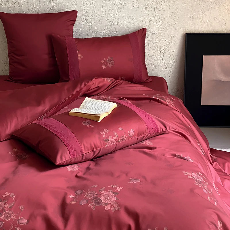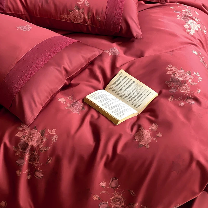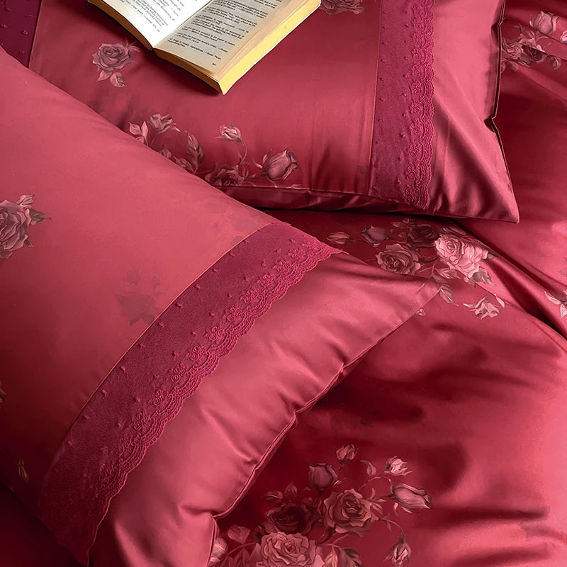 1000TC Egyptian Cotton Red Vintage Rose Print Lace Wedding Bedding Set Duvet Cover Set Flat/Fitted Bed Sheet Pillowcases 4Pcs