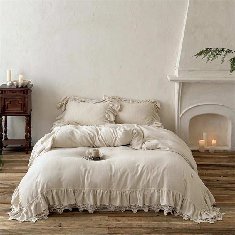 20% Linen And 80% Cotton Double Layer Lace Ruffles Vintage French Bedding Set Duvet Cover Flat/Fitted Bed Sheet Pillowcases 4Pcs