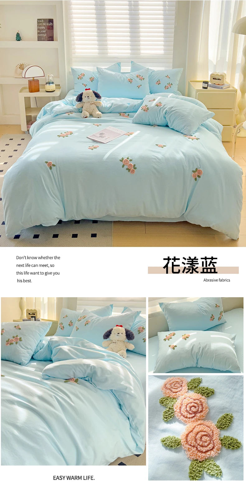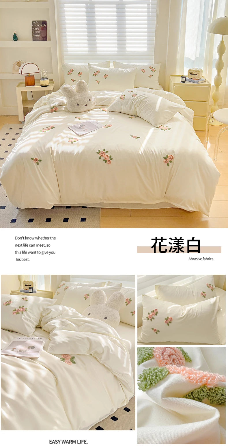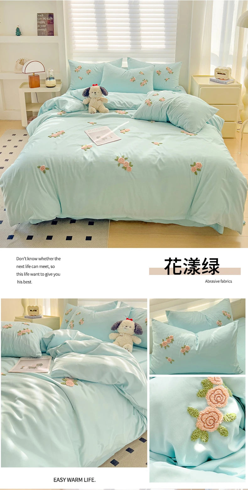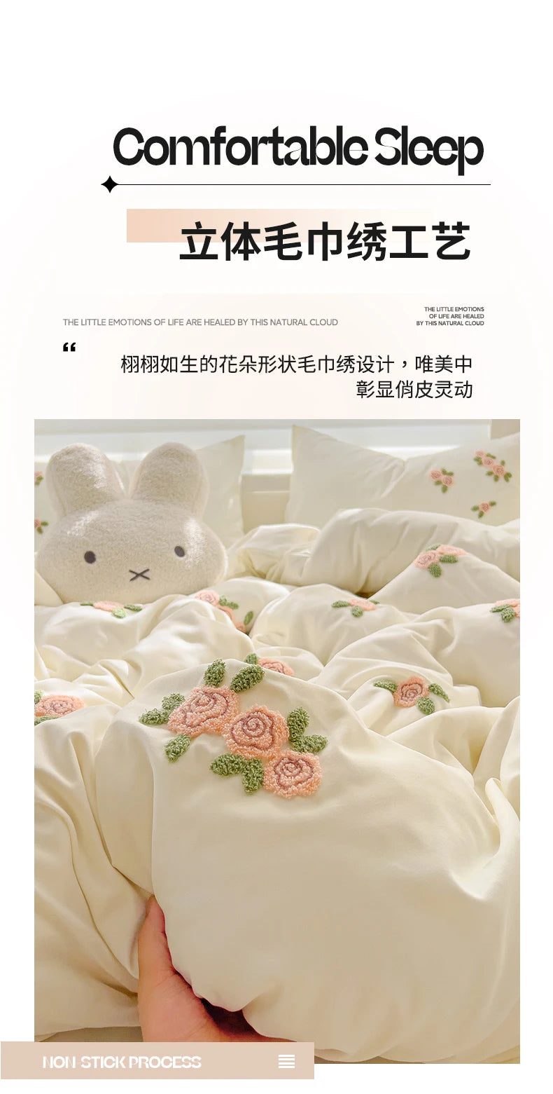 3/4Pcs Washed Cotton Skin-friendly Soft Princess Rose Towel Embroidery Flowers Bedding Set Soft Duvet Cover Bed Sheet Pillowcase