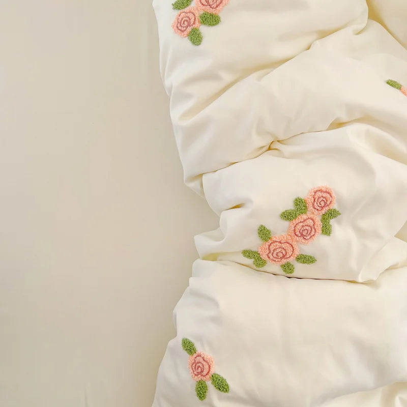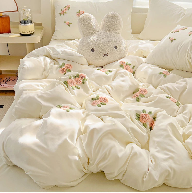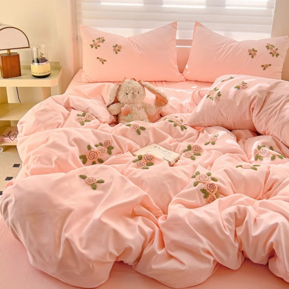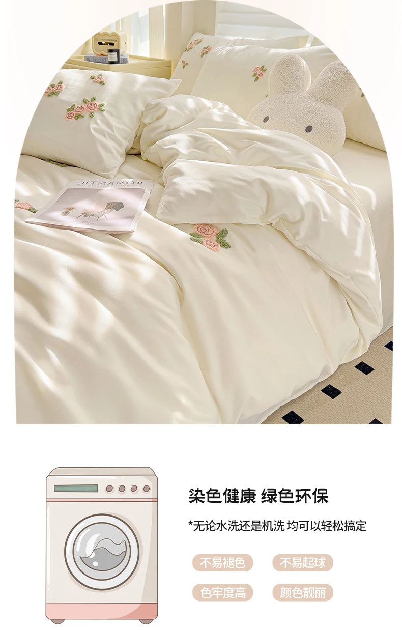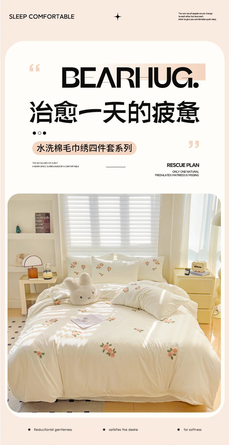 3/4Pcs Washed Cotton Skin-friendly Soft Princess Rose Towel Embroidery Flowers Bedding Set Soft Duvet Cover Bed Sheet Pillowcase