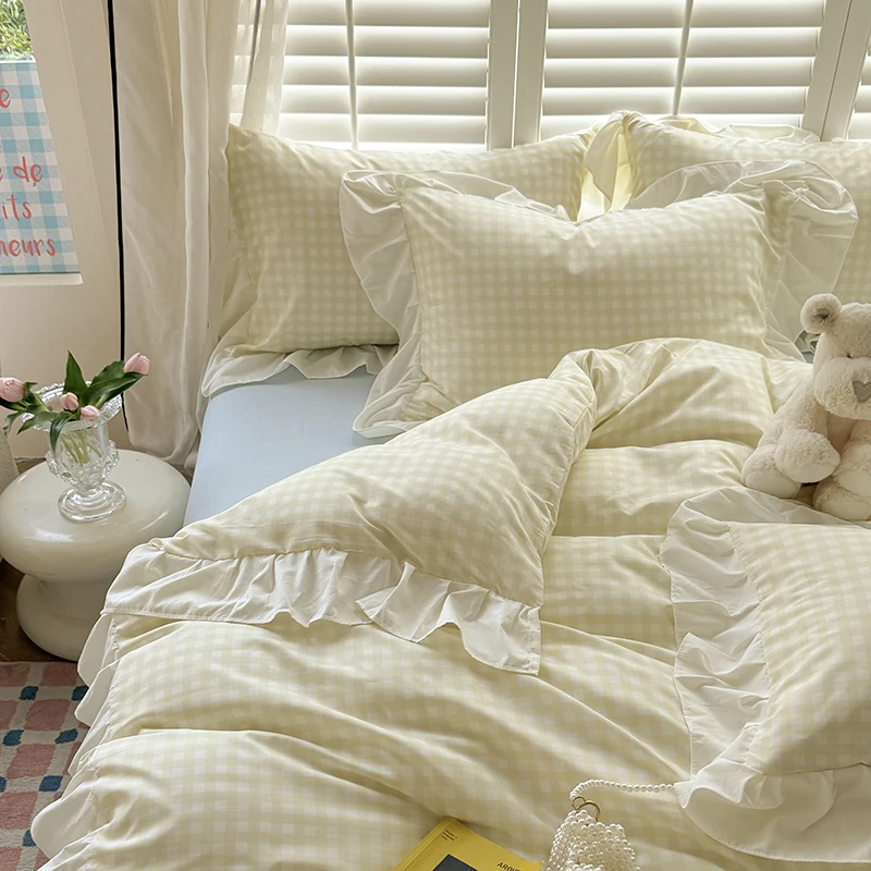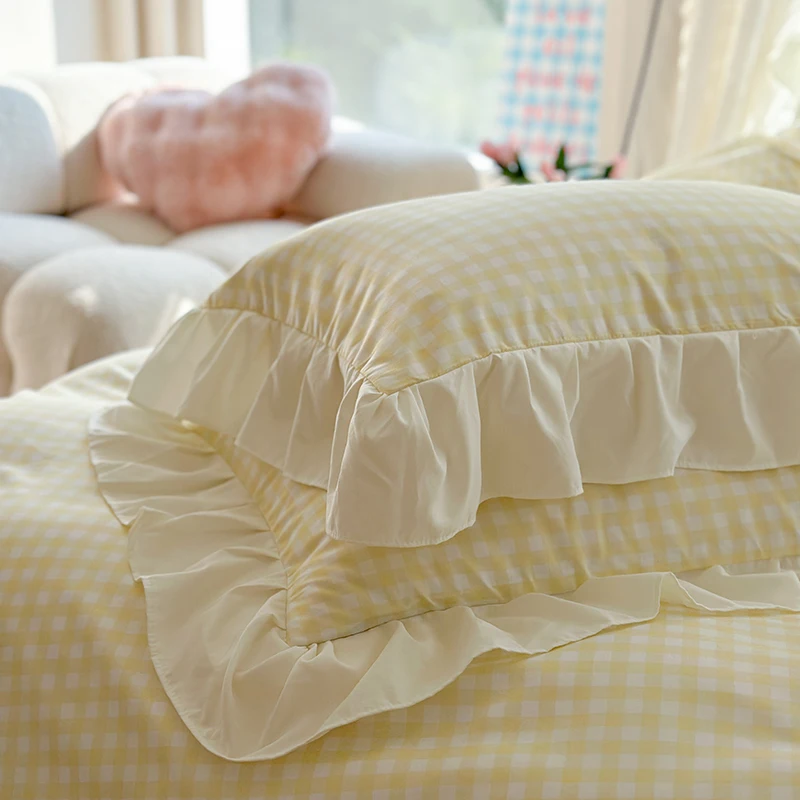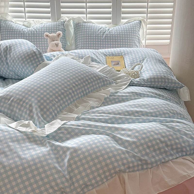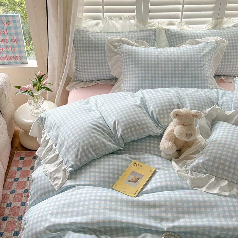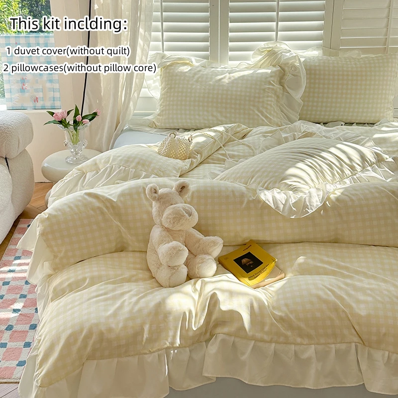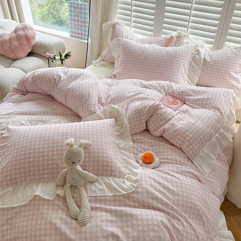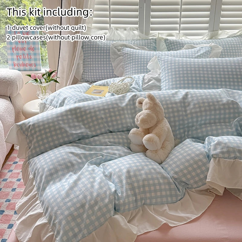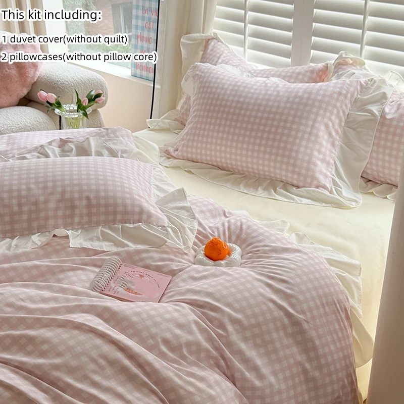 3pcs Pink Grid Bedding Set bedding set lace duvet cover and 2pcs pillowcases (no padding), suitable for bedroom