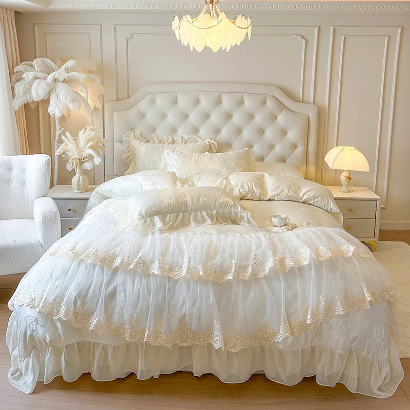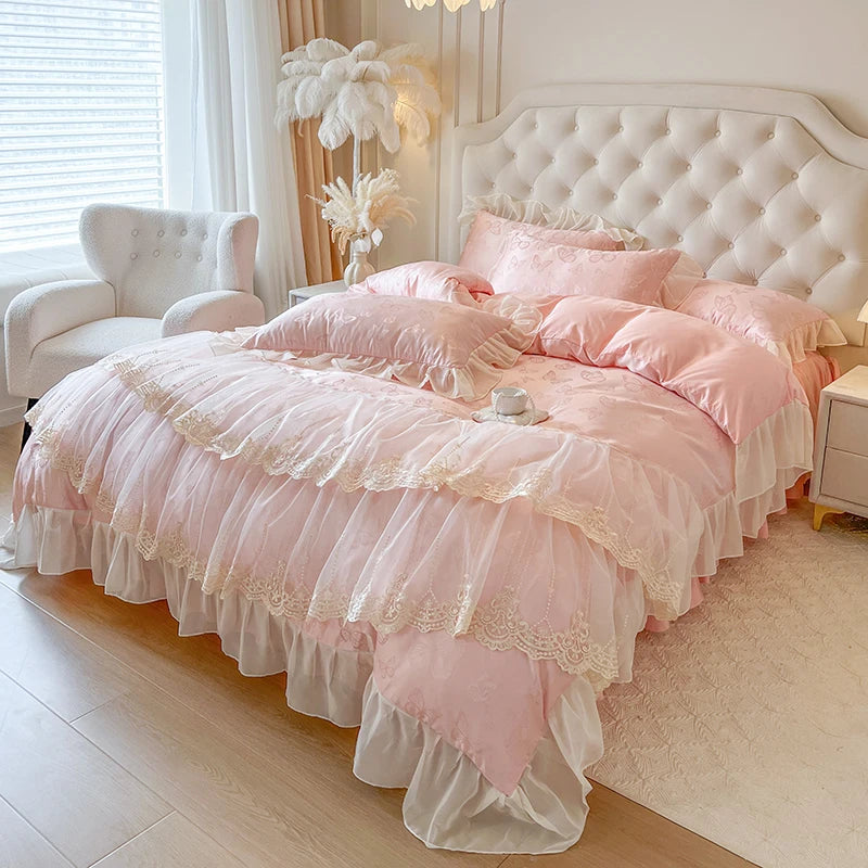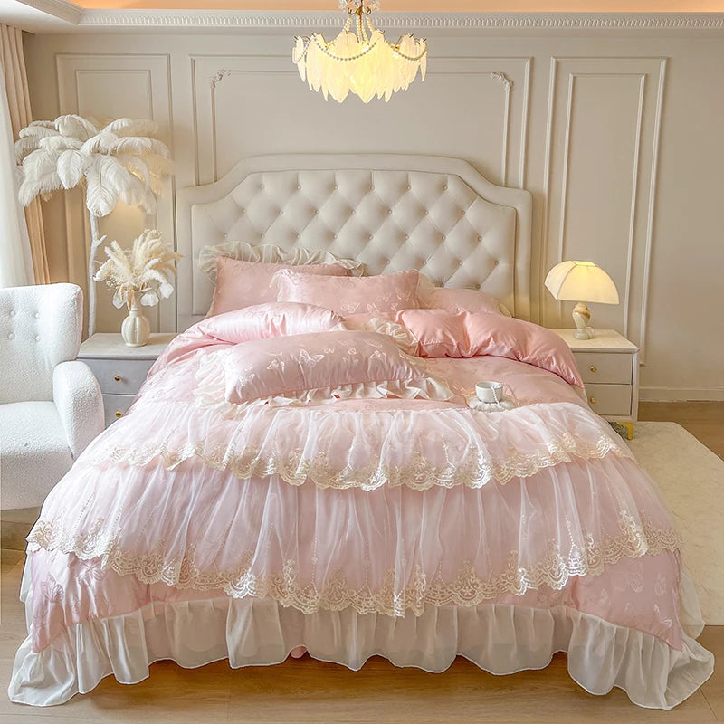 4/6Pcs Pink Butterfly Jacquard Three-layer Lace Ruffles Princess Wedding Bedding Set Duvet Cover Bed Skirt Bedspread Pillowcases