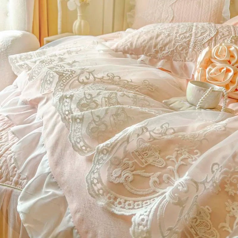 4/6Pcs Pink Princess Wedding Lace Embroidery Korean Style Bedding Set King Queen Size Duvet Cover Bed Skirt Bedspread Pillowcase