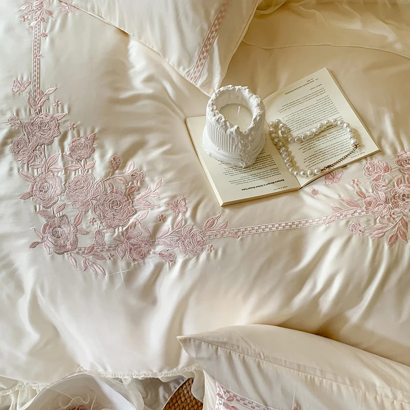 4Pcs Flowers Embroidery Lace Ruffles Princess Wedding Bedding Set Egyptian Cotton Duvet Cover Bed Sheet/Fitted Sheet Pillowcases