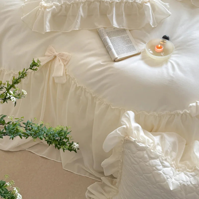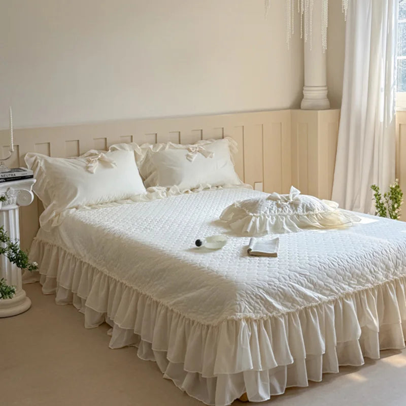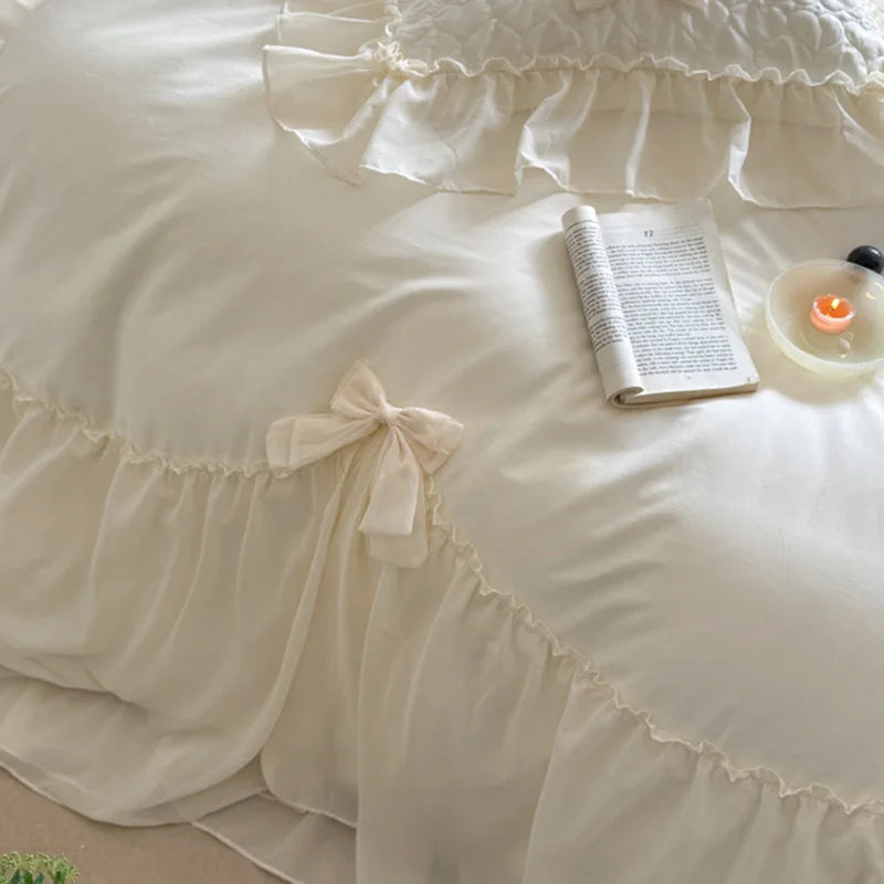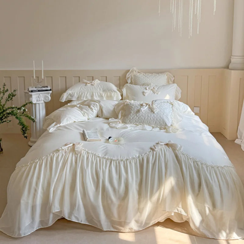 4Pcs Lace Ruffles Bow Wedding Bedding Set Pure Cotton Duvet Cover Set Double Layer Lace Quilted Bedspread Bed Sheet Pillowcases