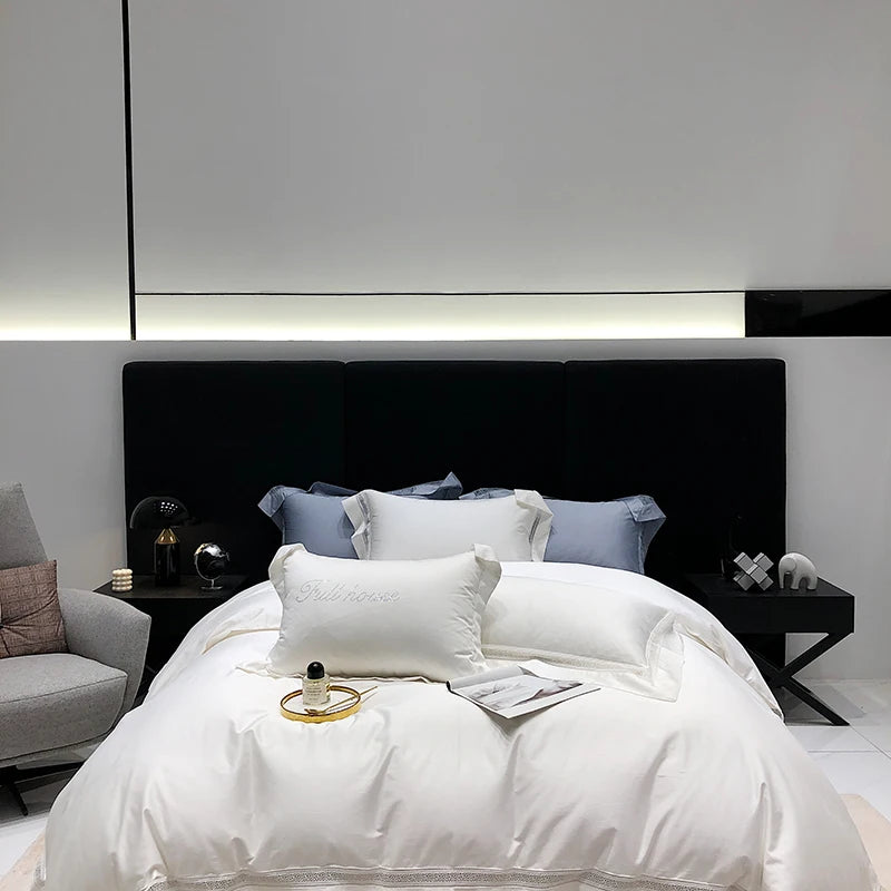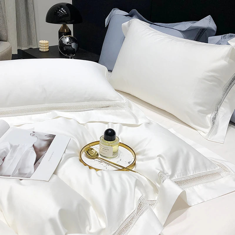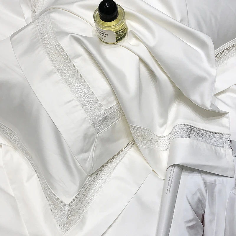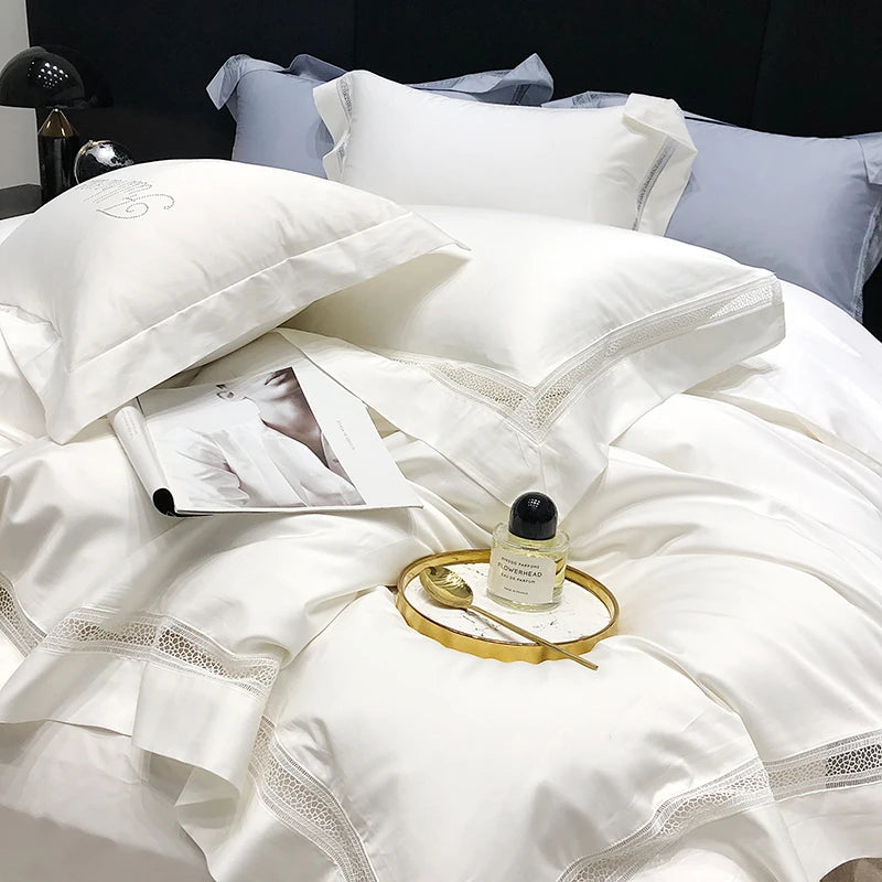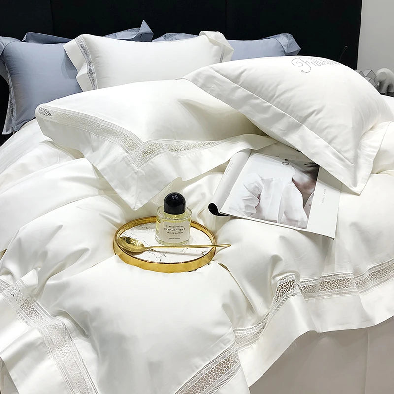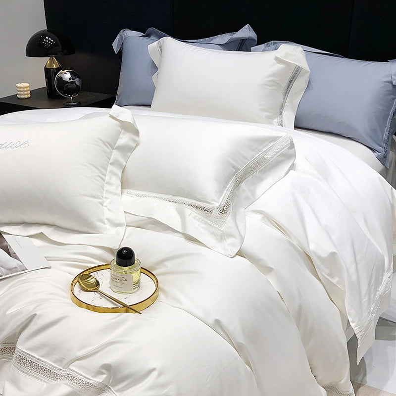 4Pcs Luxury Hollow Lace Wide Edge Solid Color Bedding Set 1000TC Egyptian Cotton Duvet Cover Bed Sheet/Fitted Sheet Pillowcases