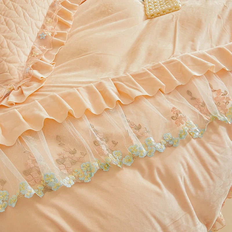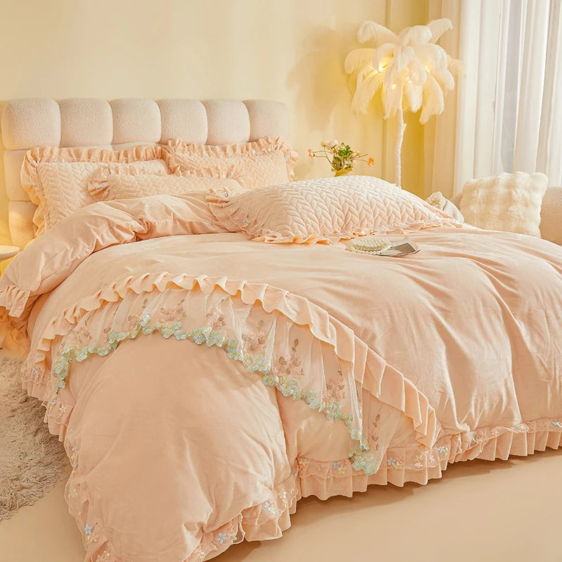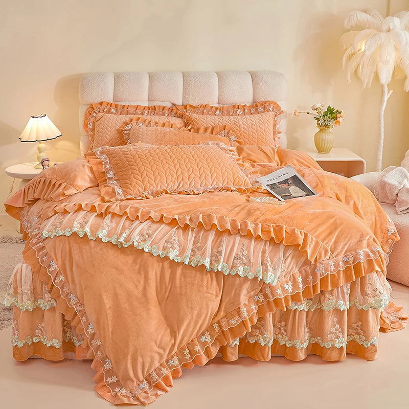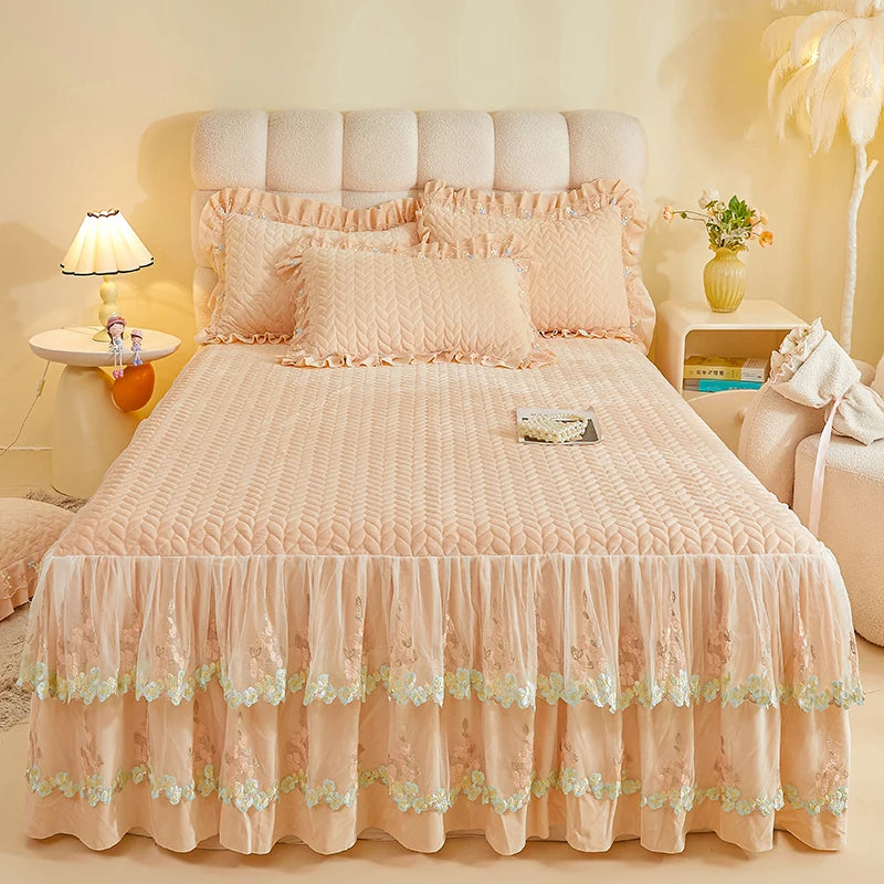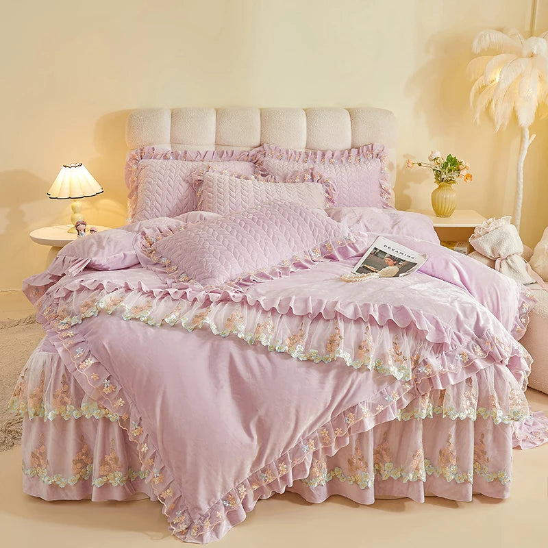 4Pcs Luxury Winter Thickened Soft Velvet Bedding Set Lace Ruffles Duvet Cover Set, Quilted Bedspread, Bed Skirt, Pillowcases