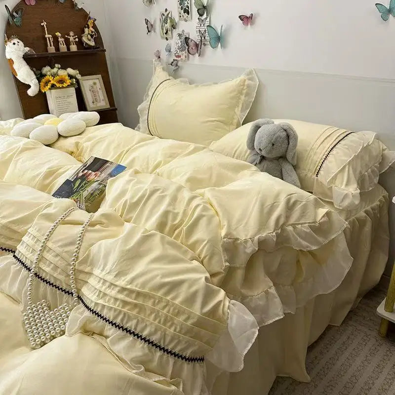 4PCS Princess Bedding Set Lace Ruffles Skin-Friendly Quilt Cover Skirt Bed Sheet Set 2 Pillowcases Queen Size For Girls Women