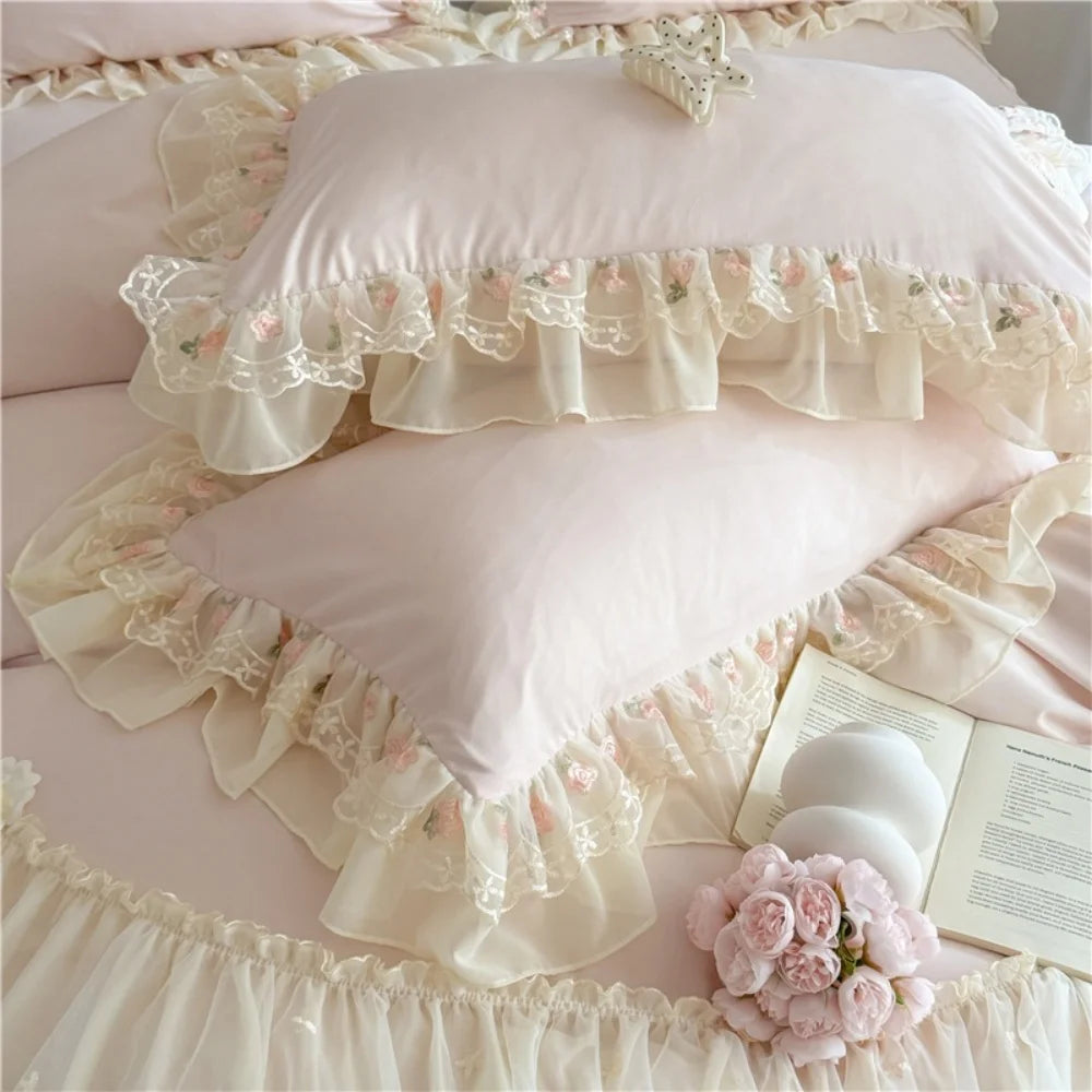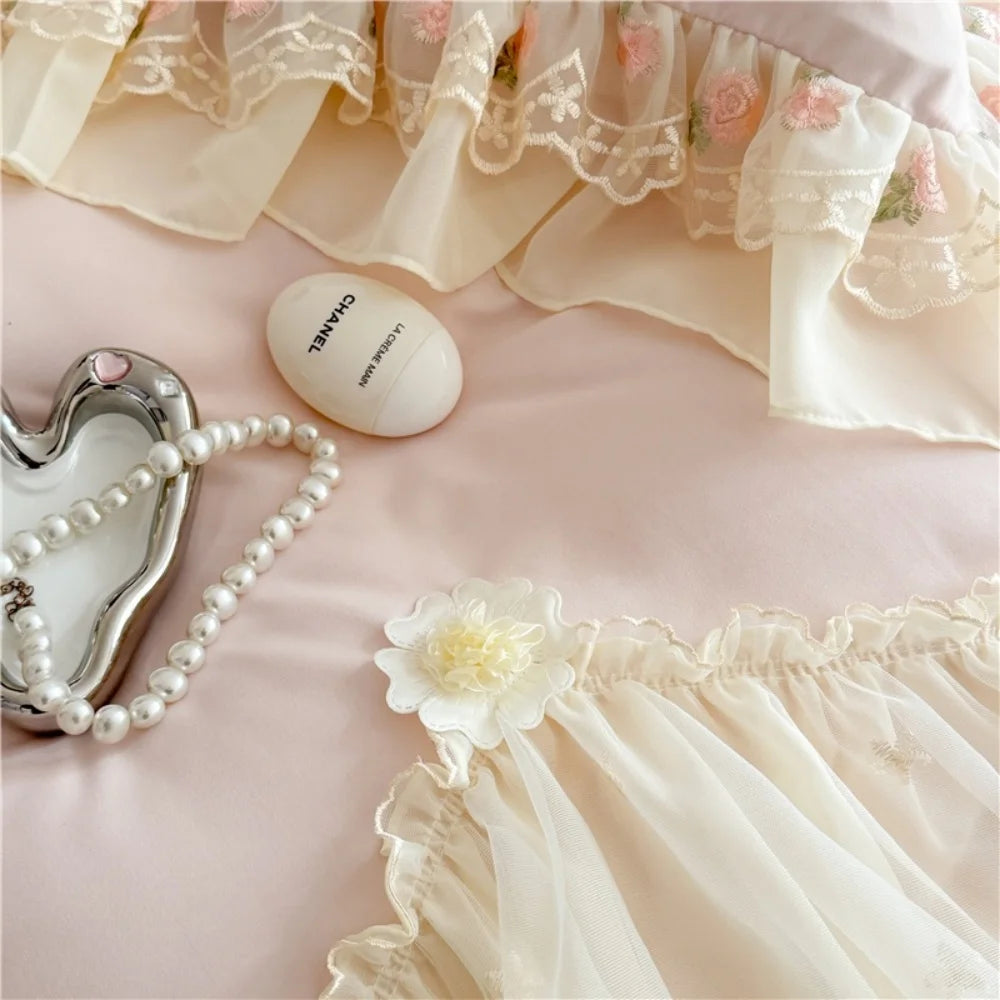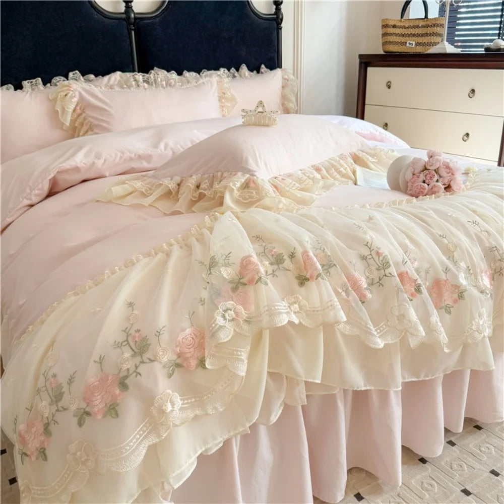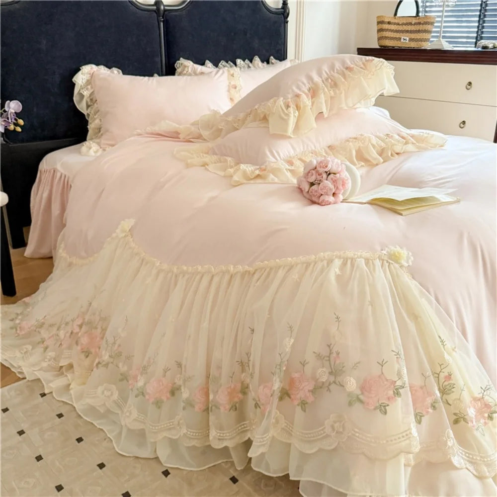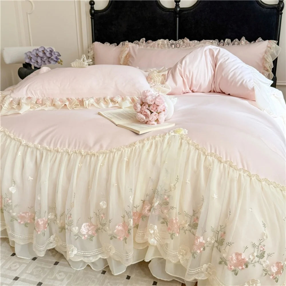 4Pcs Princess Wedding Bedding Set Korean Style Lace Flowers Embroidery Duvet Cover Bed Sheet/Fitted Sheet/Bed Skirt Pillowcases