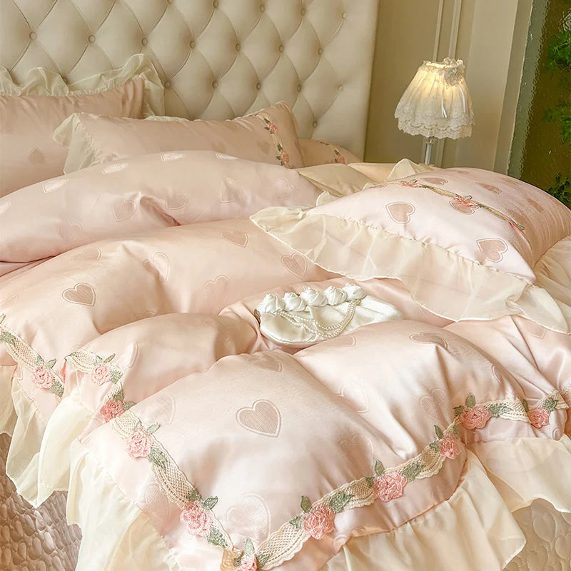 4Pcs Pure Cotton French Flowers Lace Ruffles Princess Wedding Bedding Set Duvet Cover Quilted Bedspread Bed Skirt Pillowcases