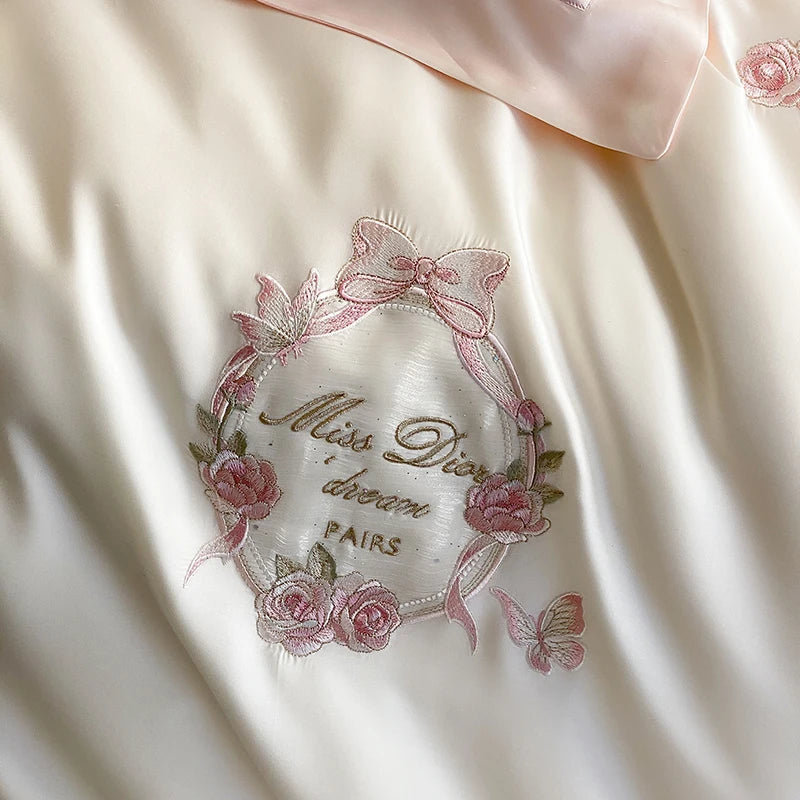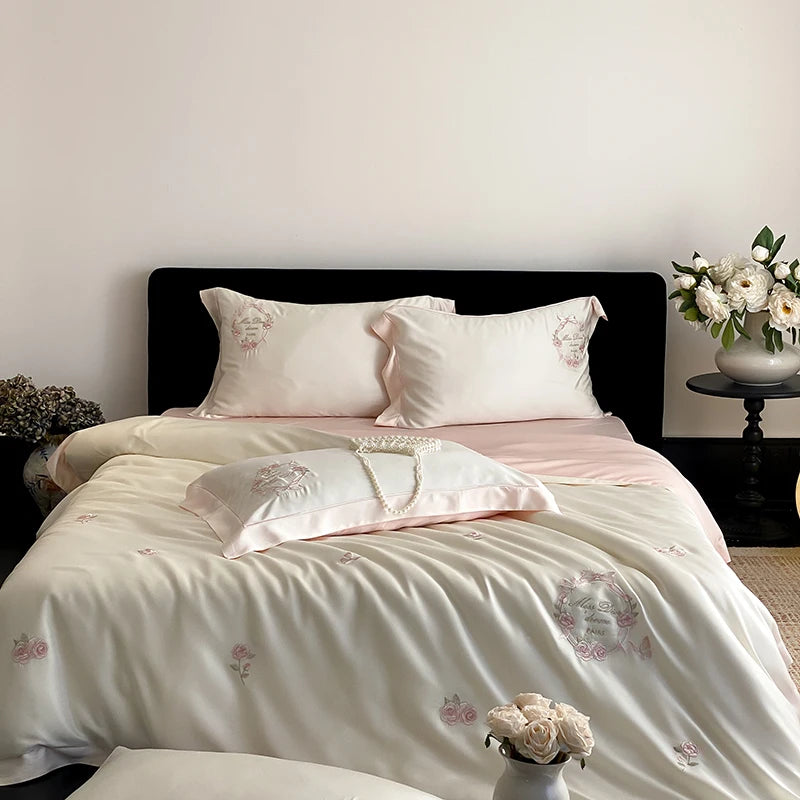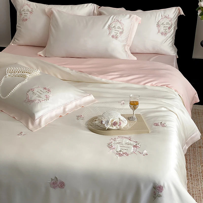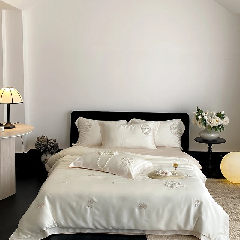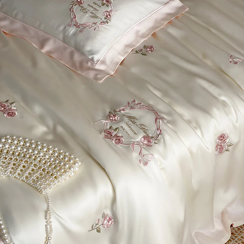 4Pcs Vintage Rose Flowers Embroidery Natural Lyocell Eucalyptus Fiber Bedding Set Duvet Cover Bed Sheet/Fitted Sheet Pillowcases