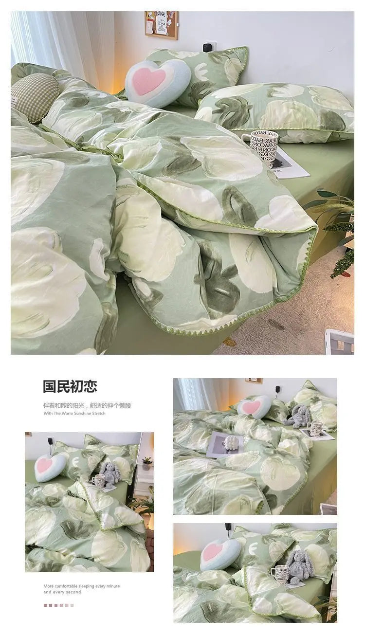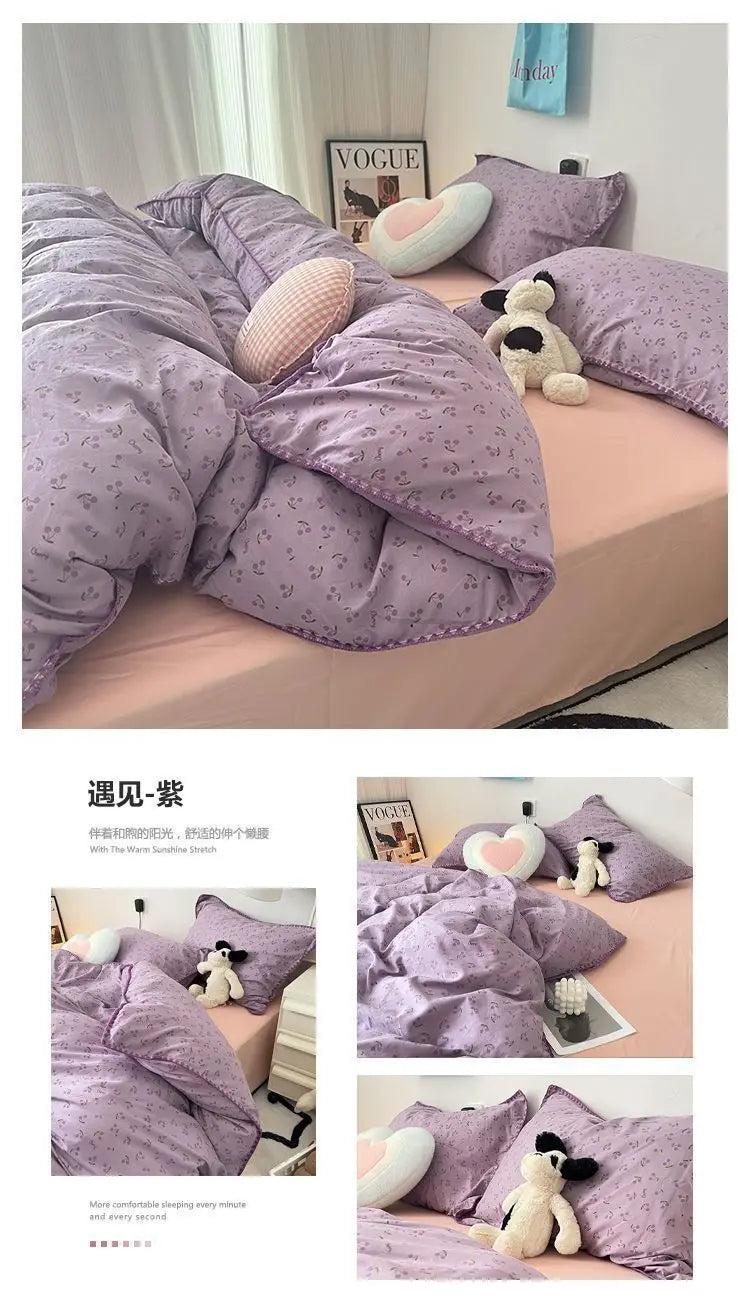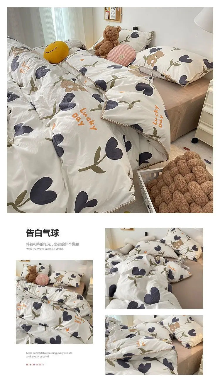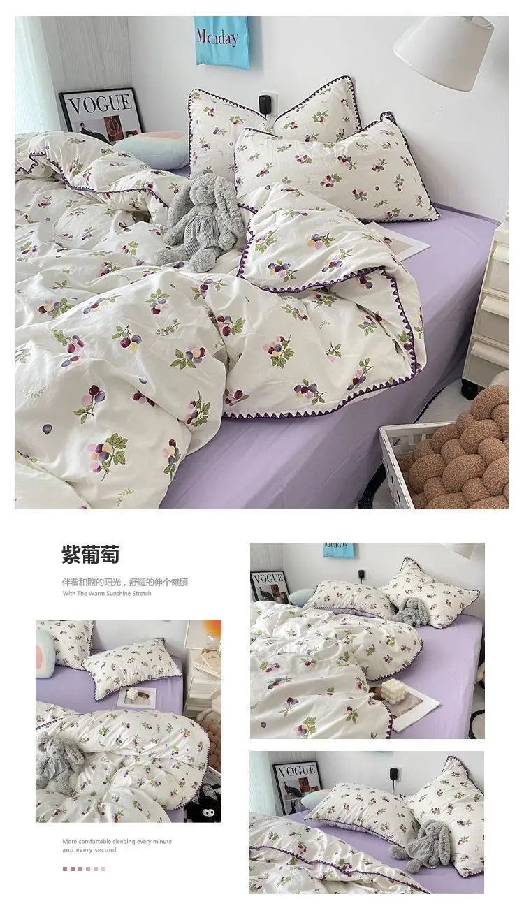 Bedding Set Double Layered Yarn INS Girls Mushroom Soft Washed Cotton Bed Sheet Queen King Size Duvet Set Pillowcase Bed Sheet