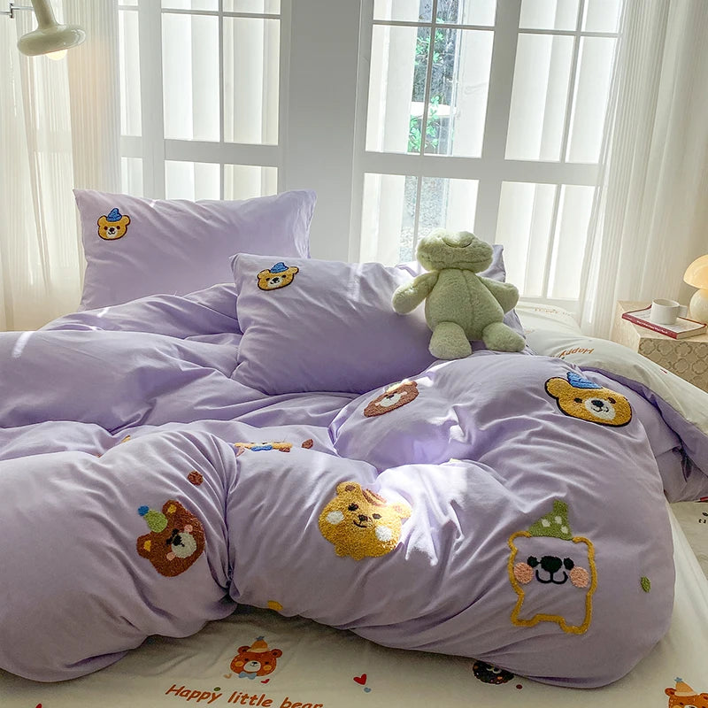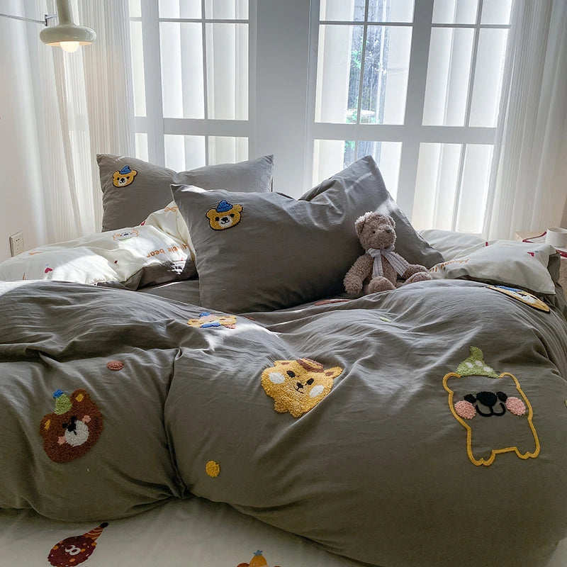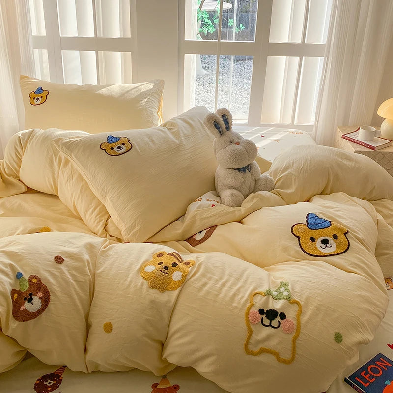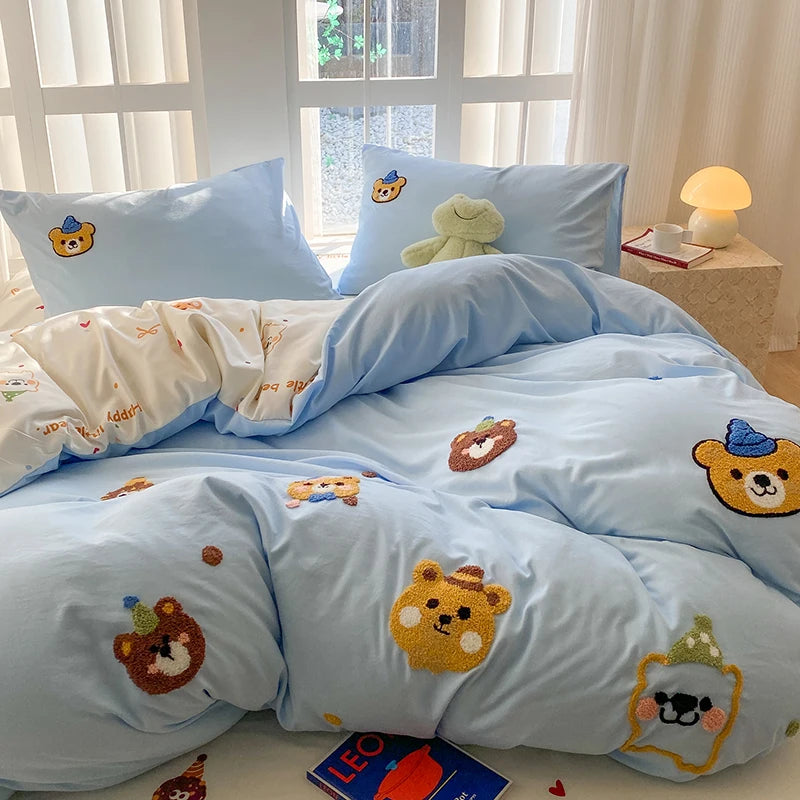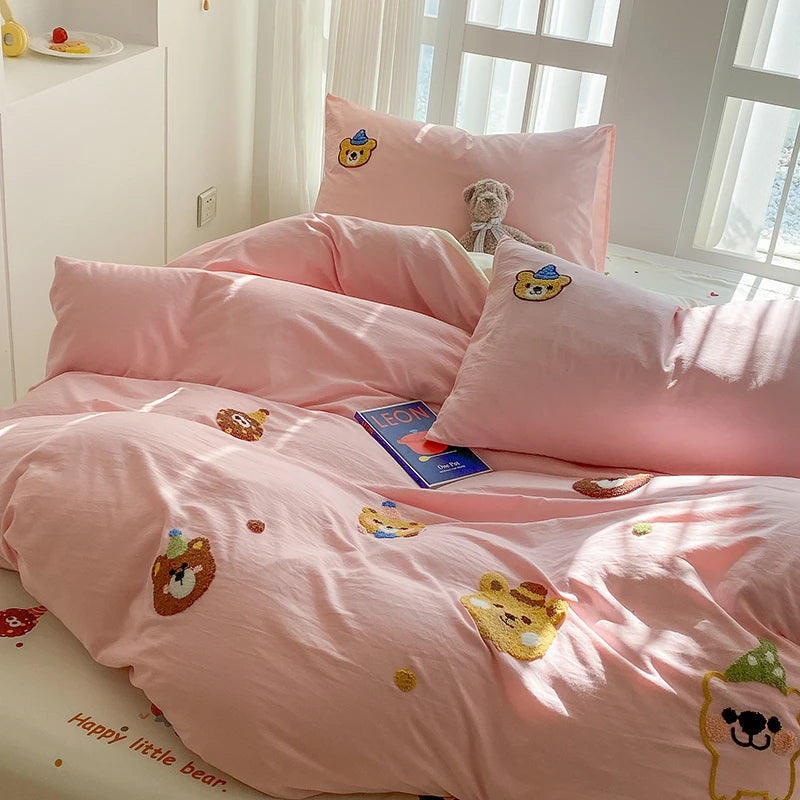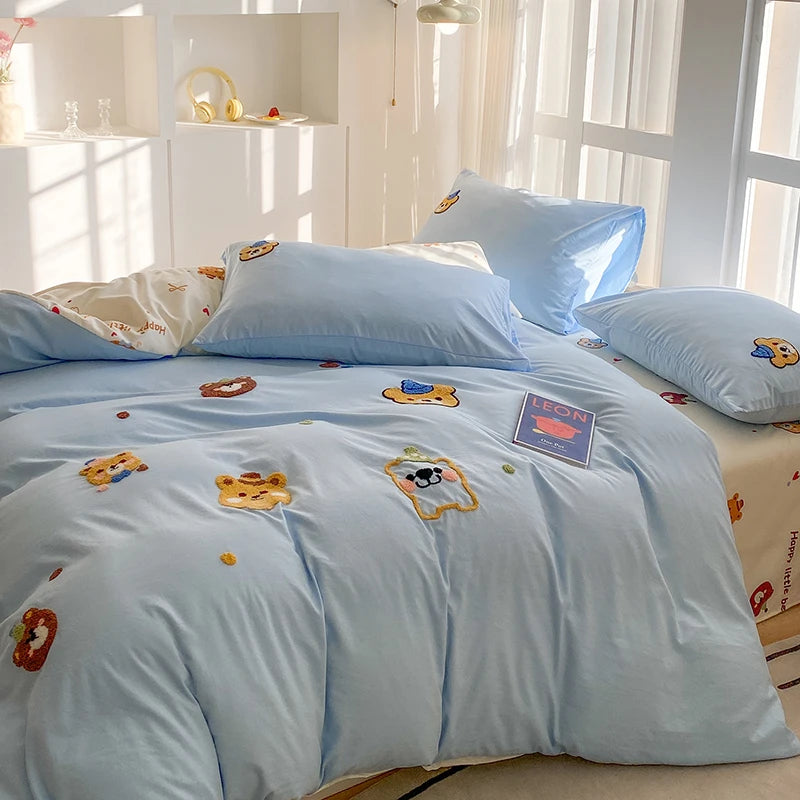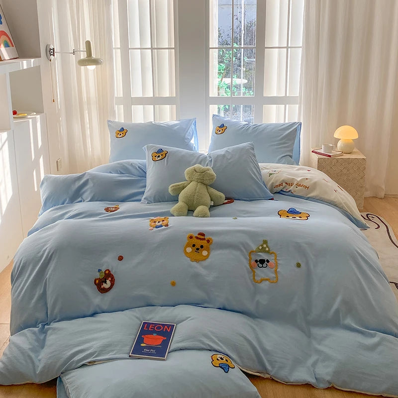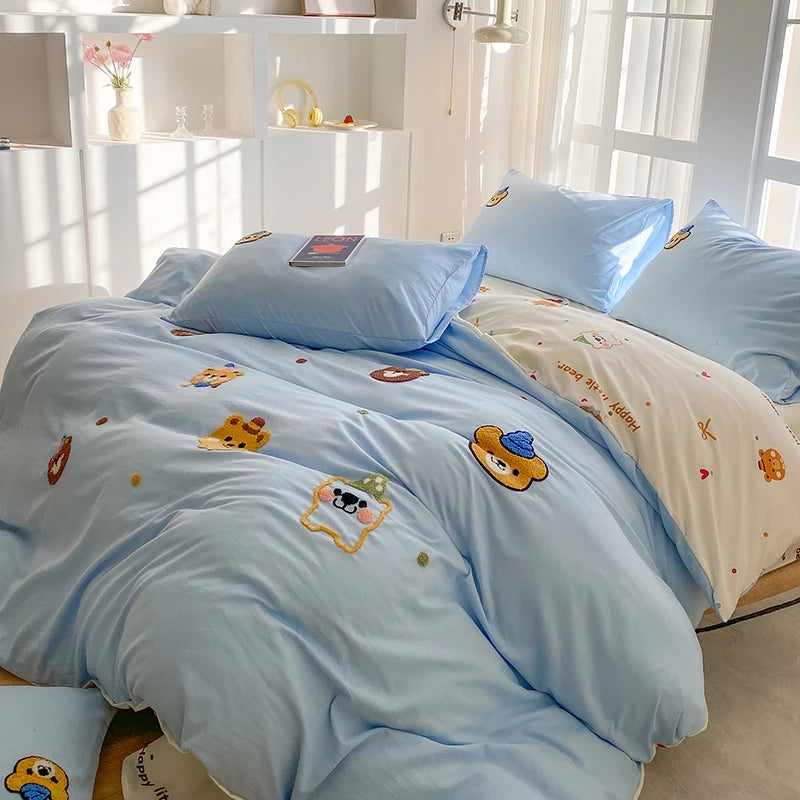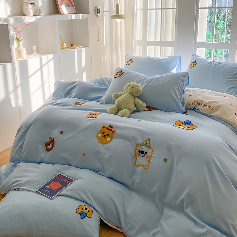 Bedding Set Ins Blue Pink lovely embroidery Mixed With Washed Cotton Minimalist Four Piece Set Fitted Sheets Duvet Cover