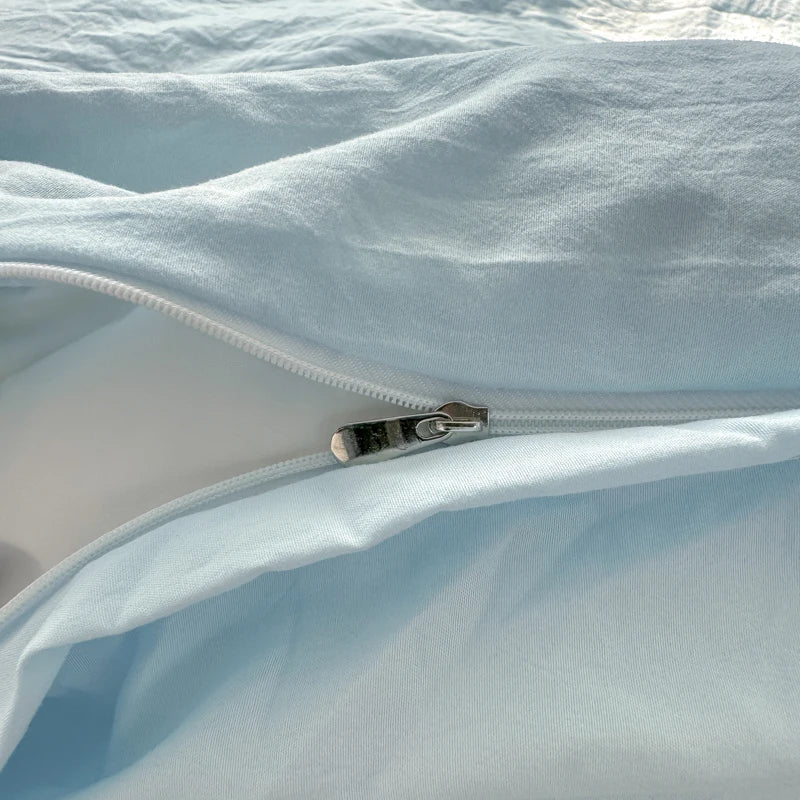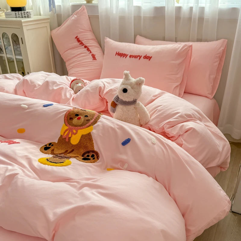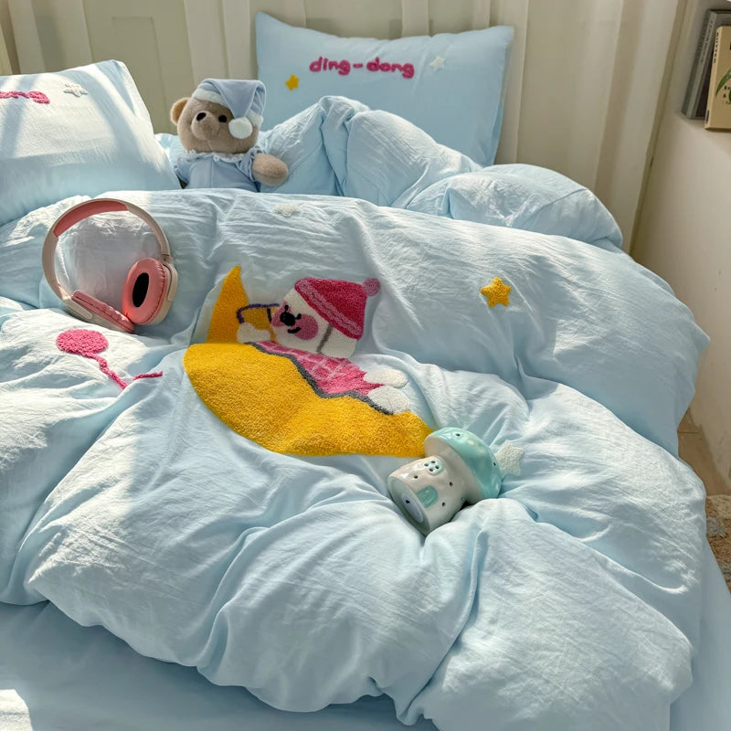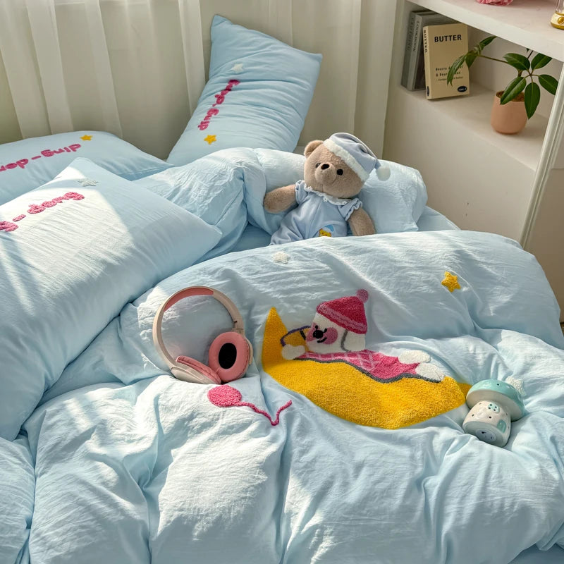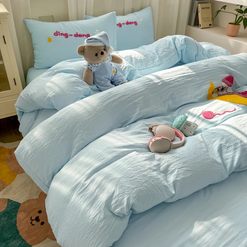 Bedding Set Ins Cute Blue embroidery Mixed With Washed Cotton Minimalist Four Piece Set Fitted Sheets Duvet Cover
