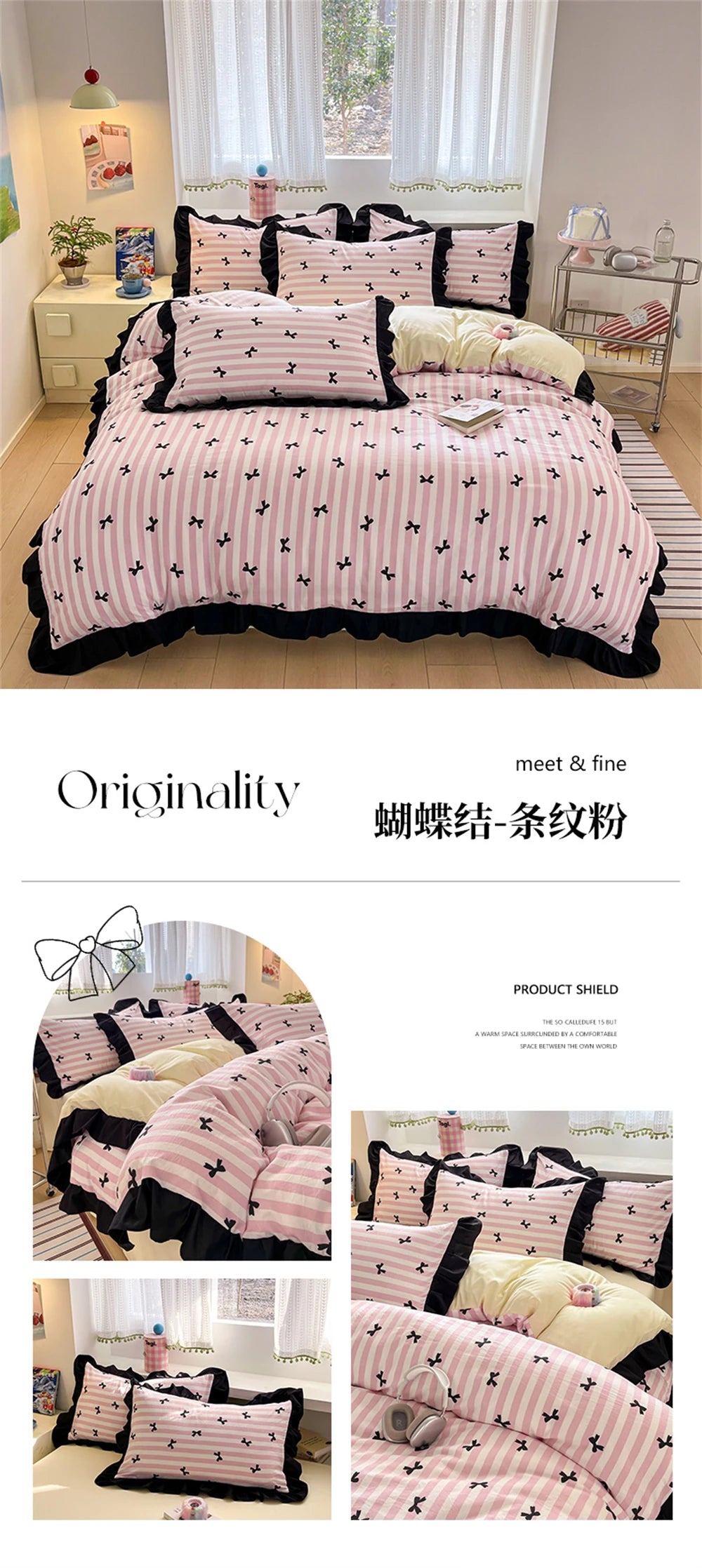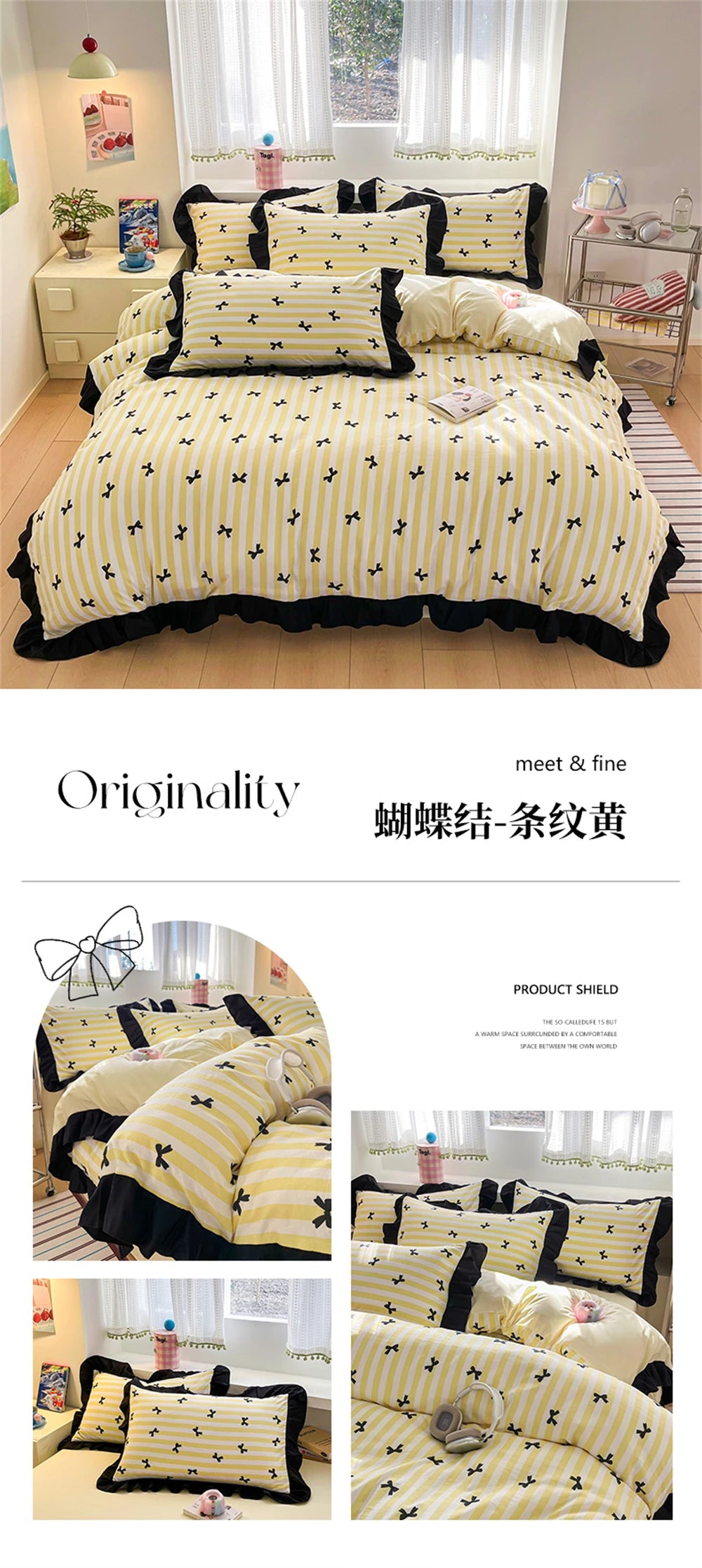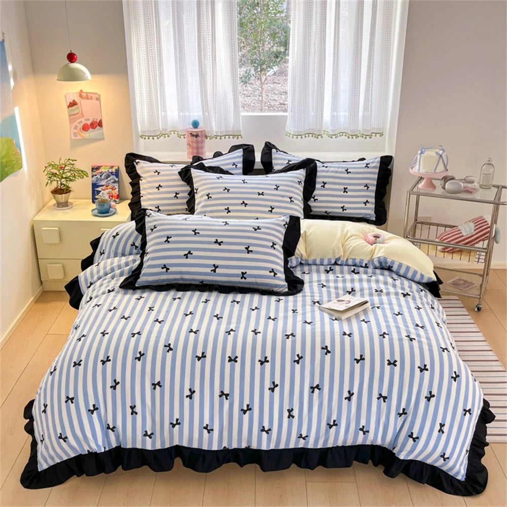 Black Lace Ruffles Korean Bow Decor Bedding Set Duvet Cover Pillowcase Washed Cotton Four-Piece Sets Soft Quilt Cover Bed Sheet